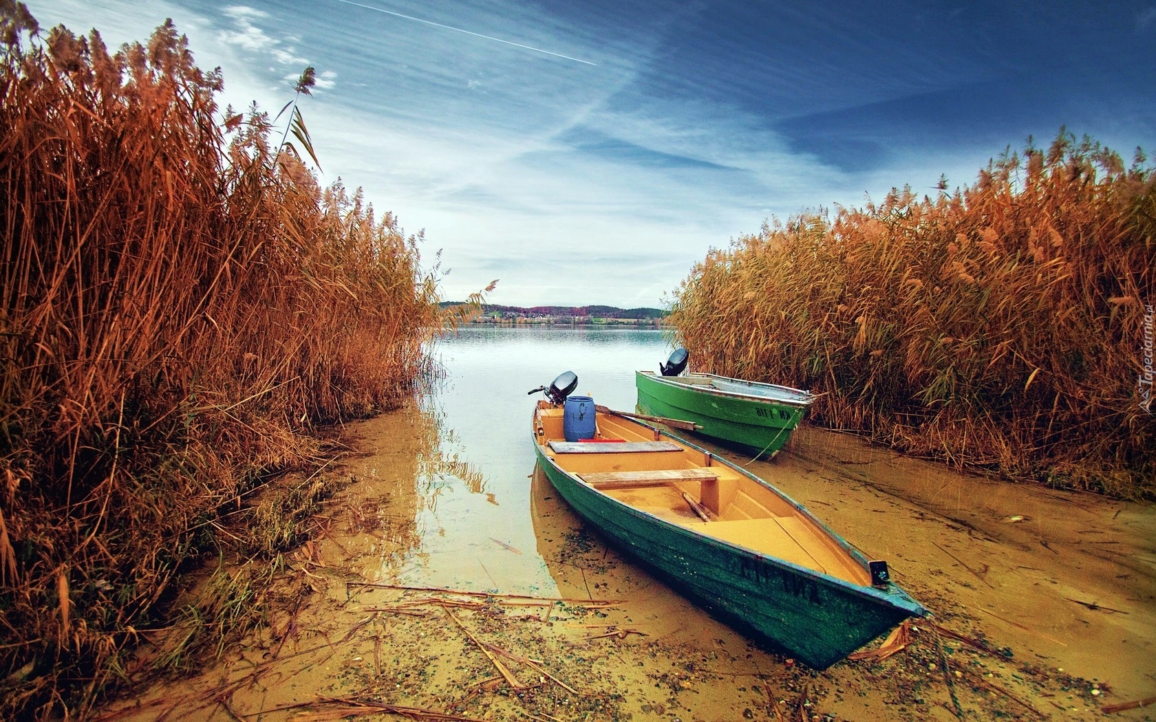Edytor tapety: Jezioro, Szuwary, Łódki
