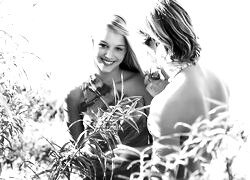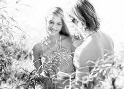 Edytor tapety: Kobieta, Mężczyzna, Rozmowa, Zaloty, Krzewy, Liście