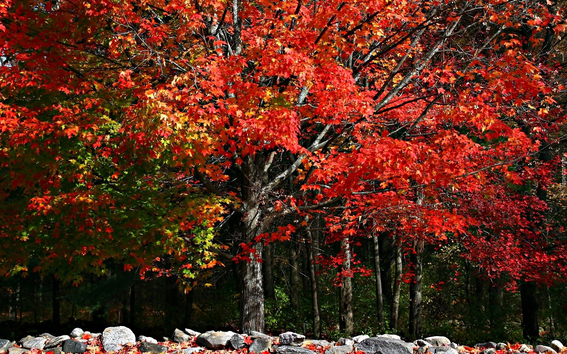 Edytor tapety: Jesień, Las, Drzewa, Liście, Kolorowe, Kamienie