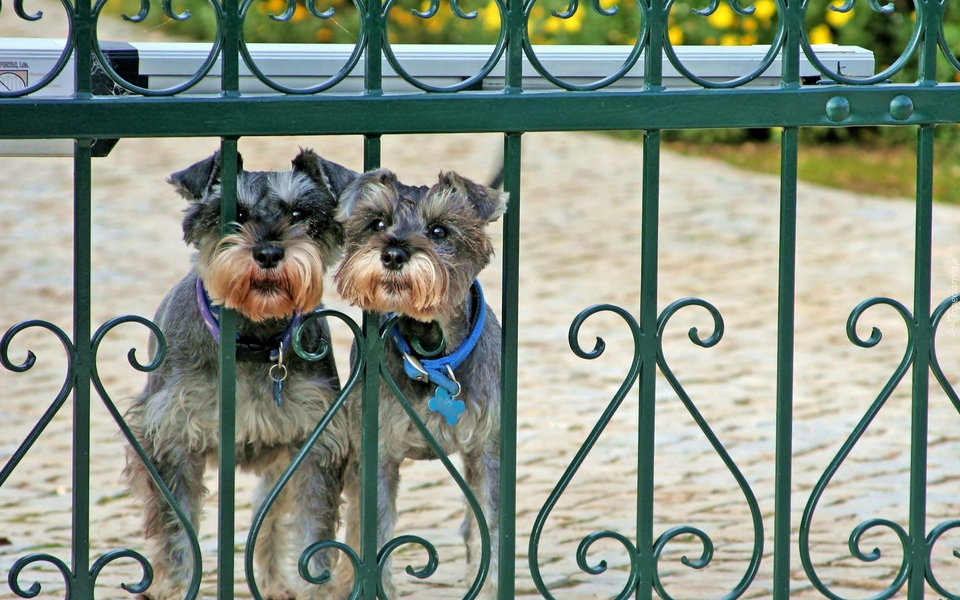 Edytor tapety: Dwa, Psy, Sznaucery, Miniaturka, Ogrodzenie