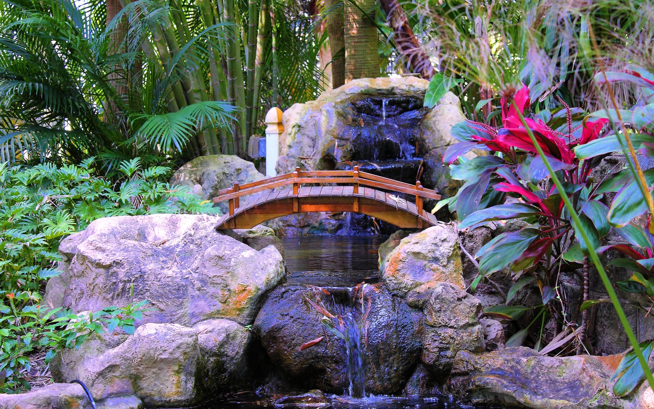 Edytor tapety: Park, Rzeczka, Mostek, Skały, Palmy, Kwiaty