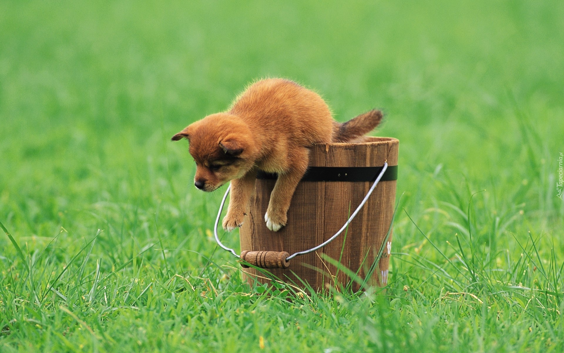 Edytor tapety: Szczeniak, Wiaderko, Trawa