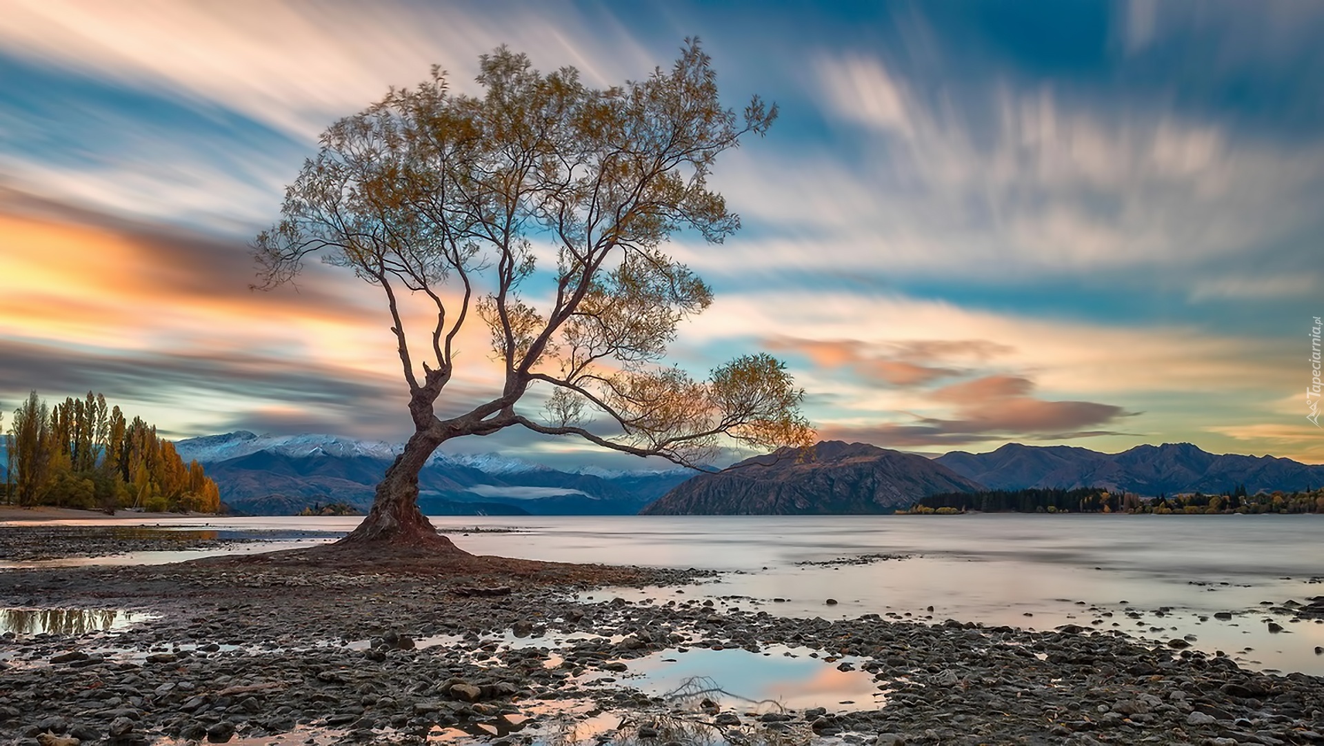 Edytor tapety: Zachód, Słońca, Skały, Jezioro, Drzewo