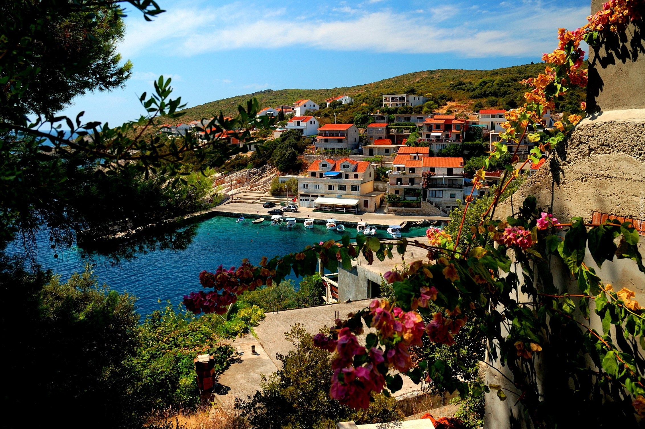 Edytor tapety: Krajobraz, Morze, Domy, Miasteczko, Wzgórze