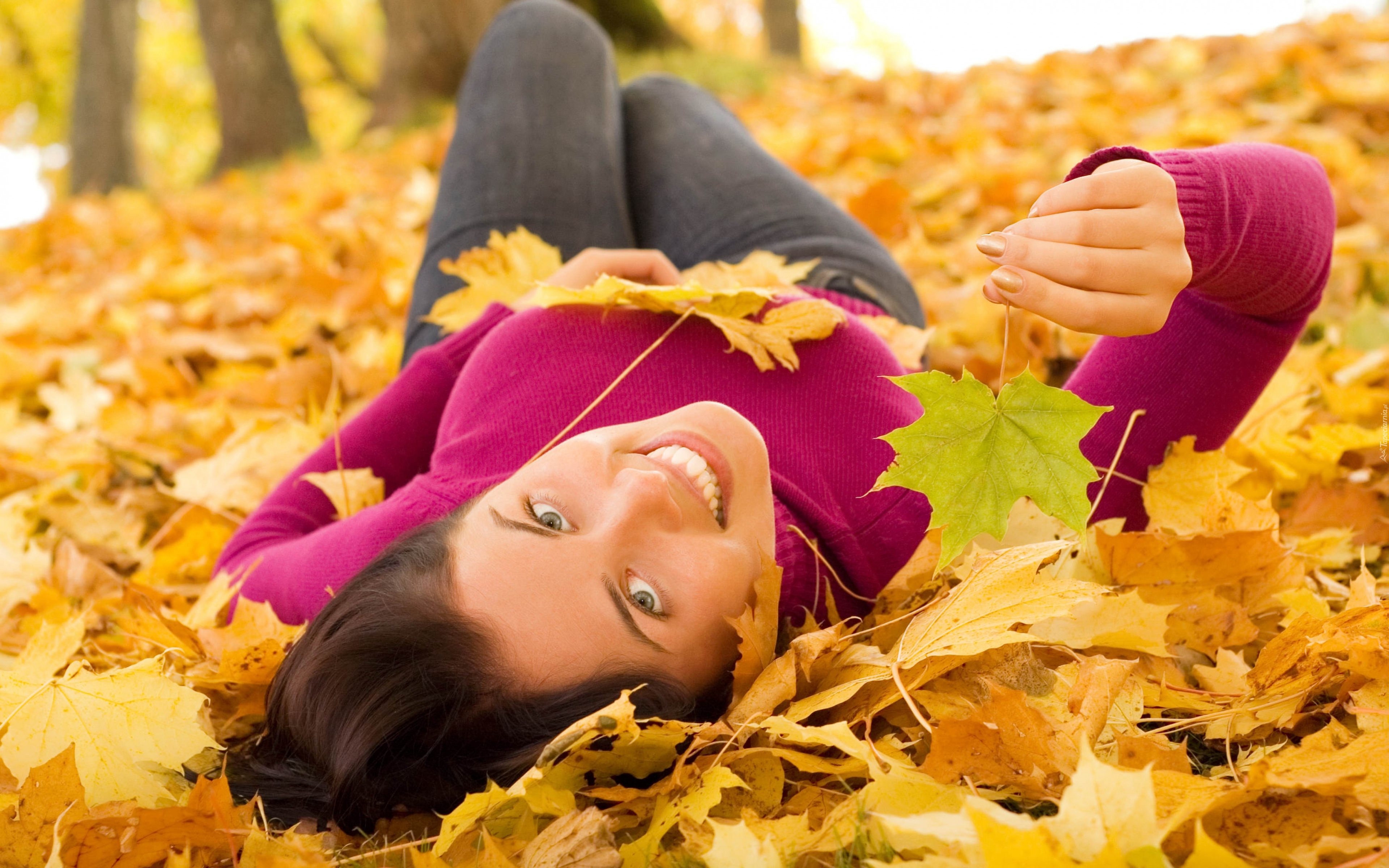Edytor tapety: Kobieta, Leżąca, Jesień, Liście, Uśmiech, Oczy, Zęby