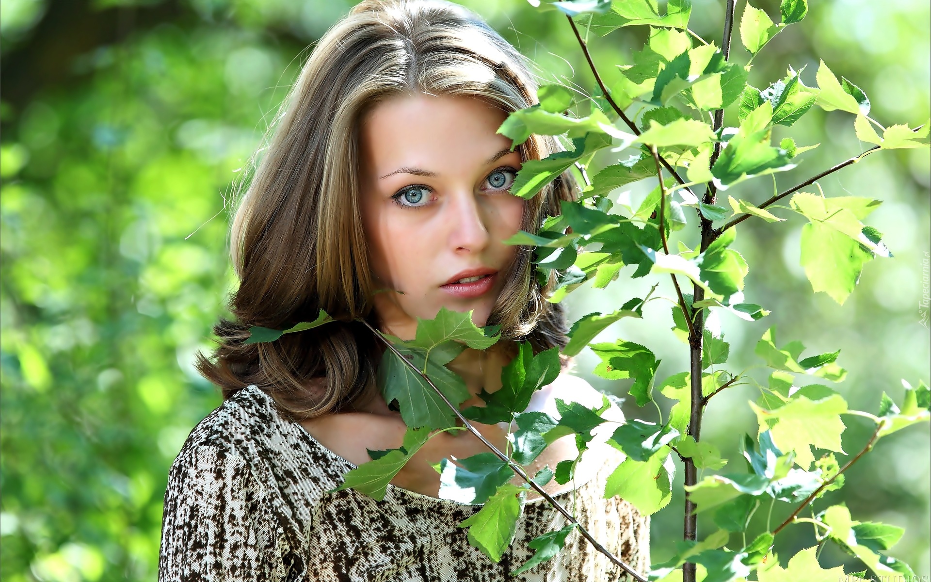 Edytor tapety: Dziewczyna, Drzewo, Dąb, Liście, Oczy, Usta