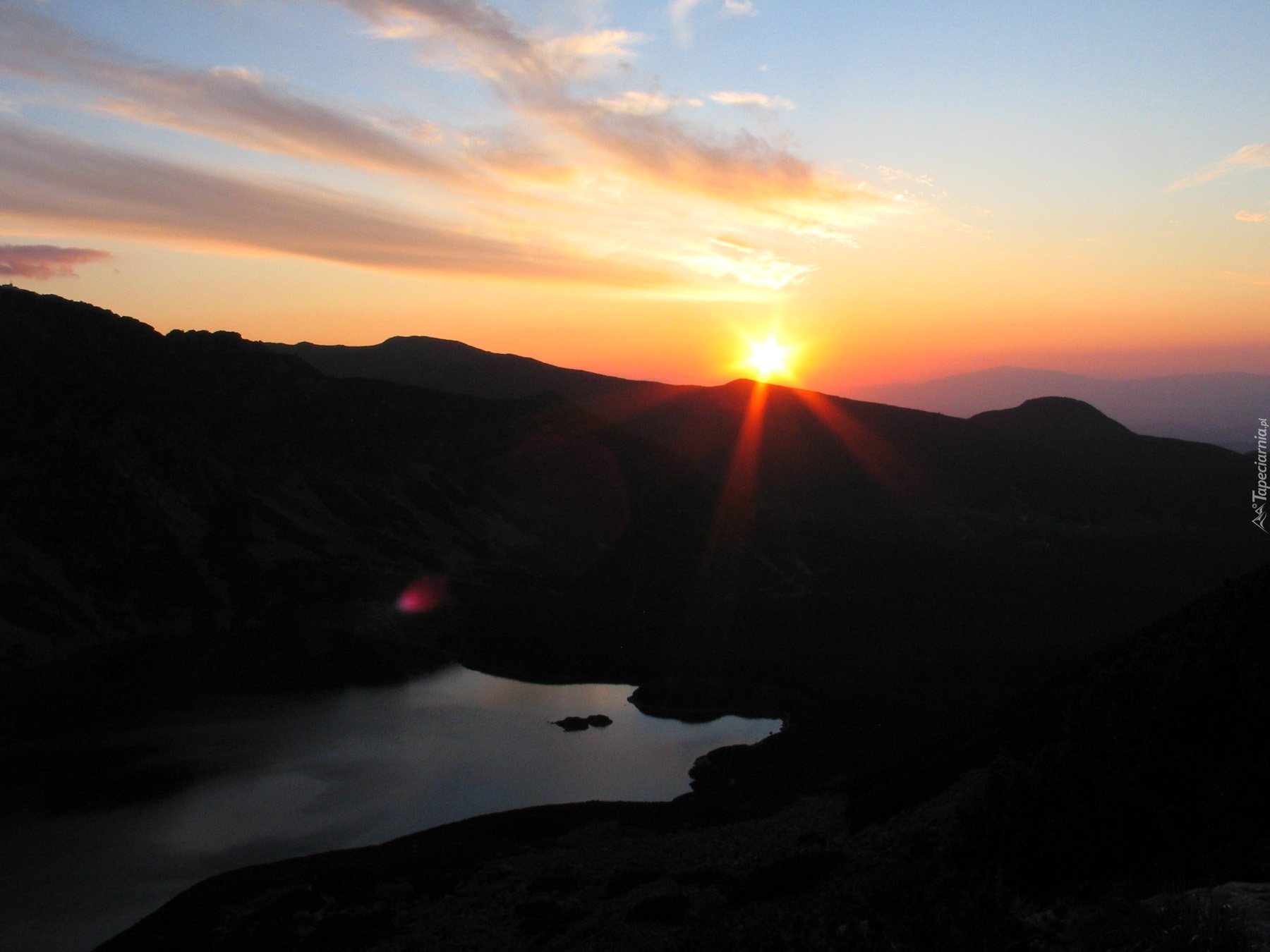 Edytor tapety: Góry, Zachód słońca, Jezioro, Niebo