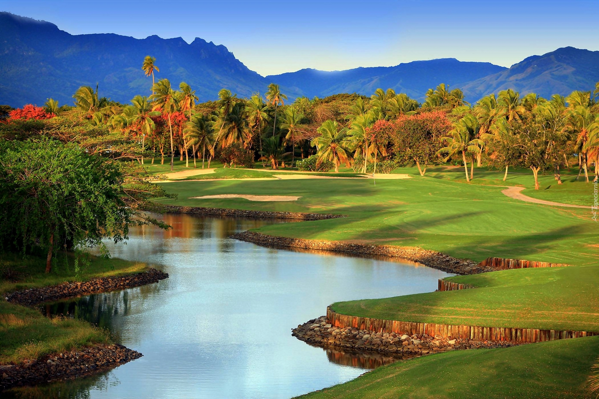 Edytor tapety: Rzeka, Góry, Drzewa, Trawa, Kamienie, Jesień