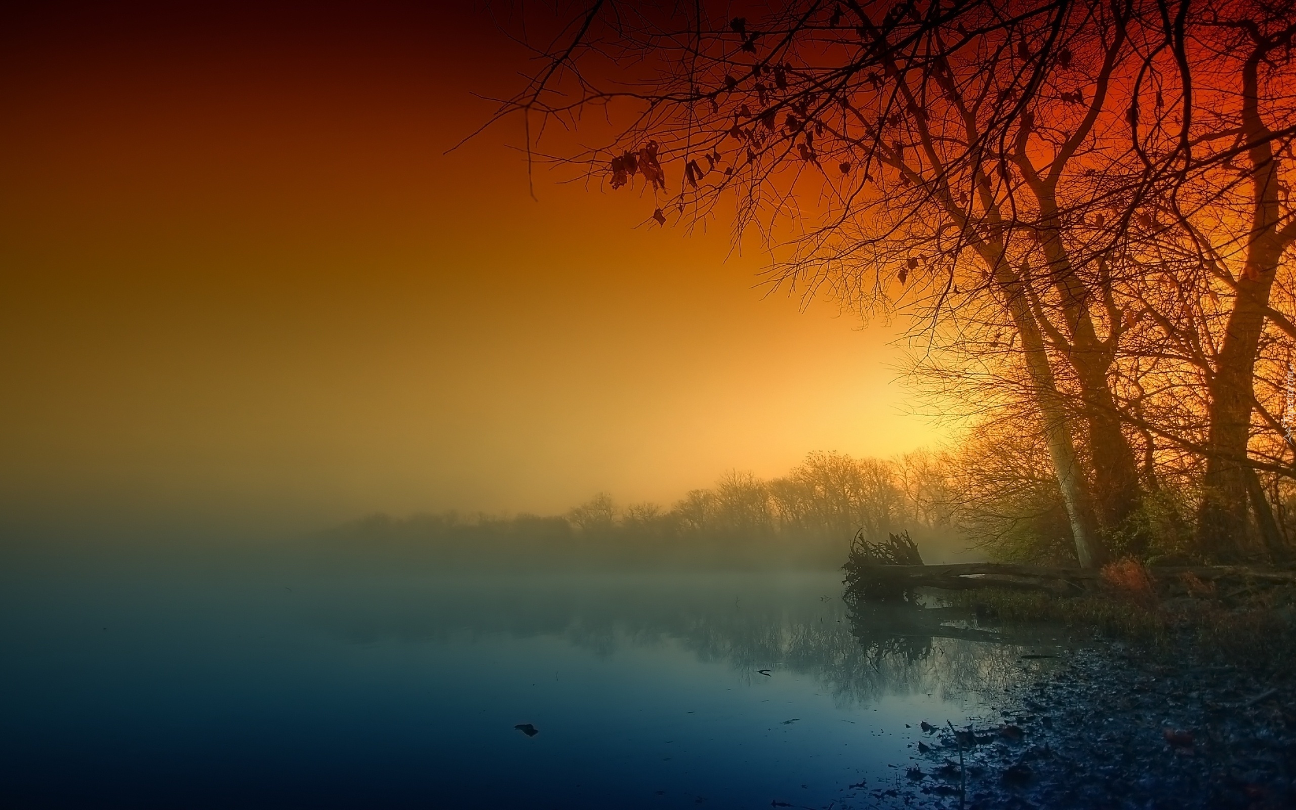Edytor tapety: Jezioro, Las, Mgła, Wschód, Słońca, Jesień