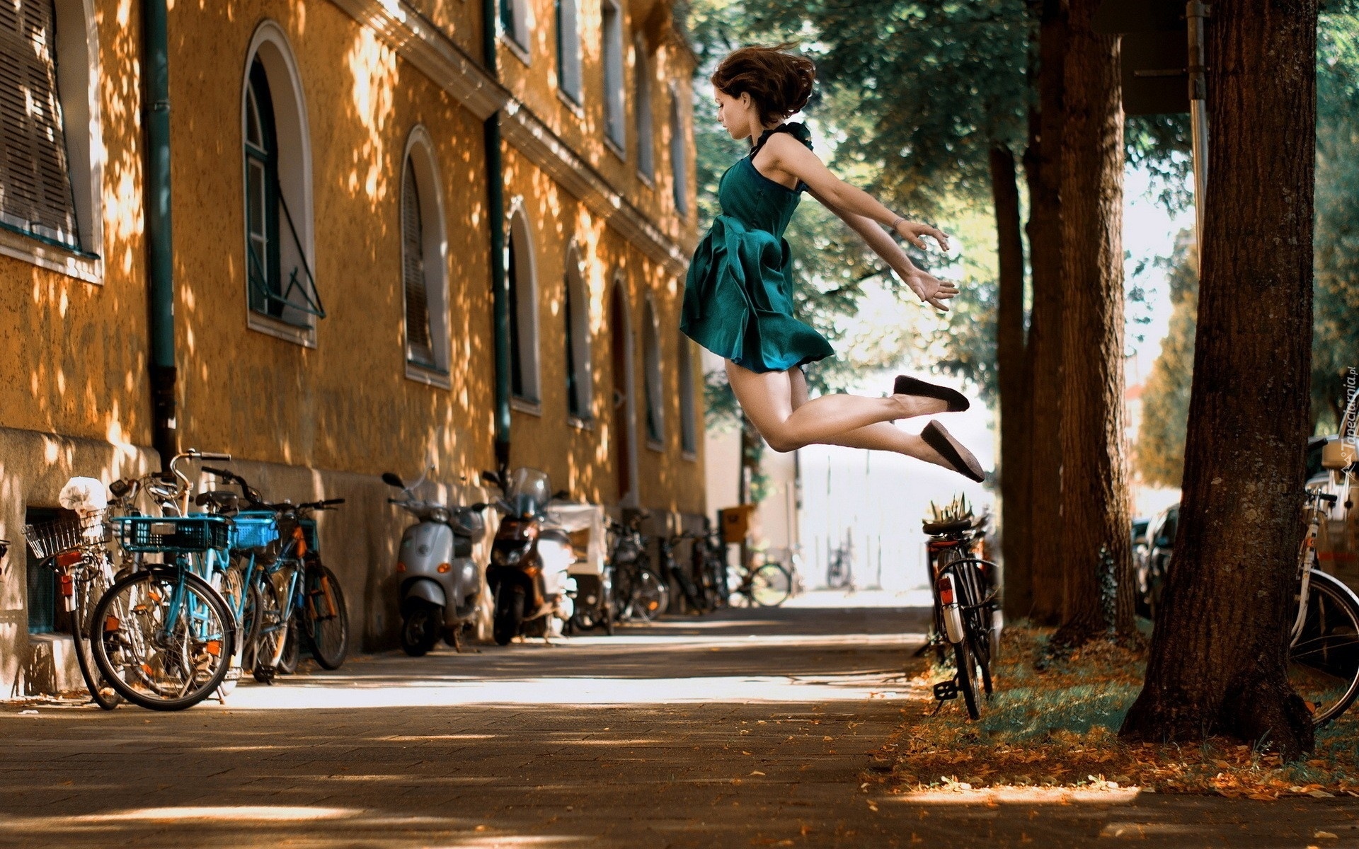 Edytor tapety: Dziewczyna, Radość, Ulica, Drzewa, Rower, Motocykl