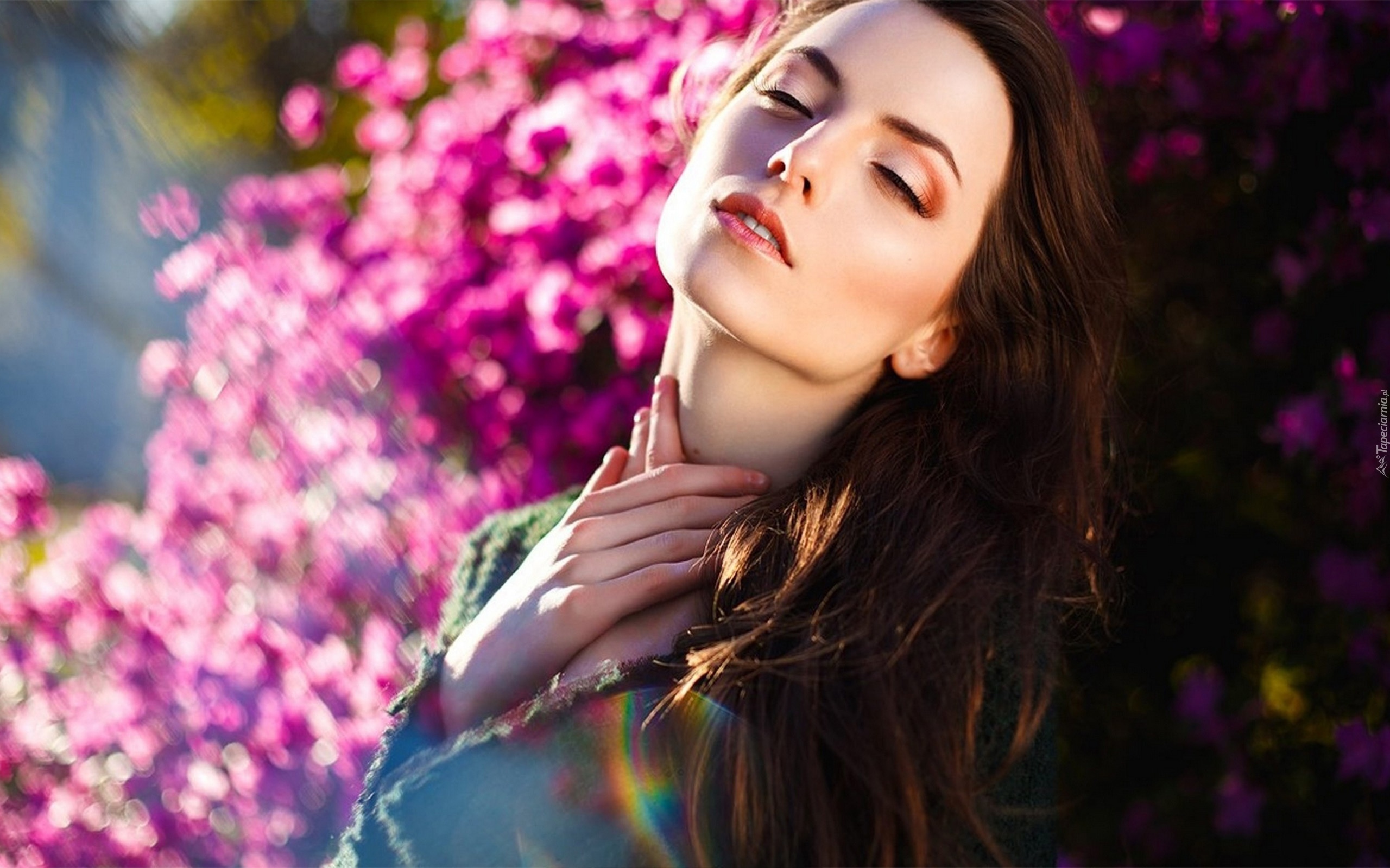 Edytor tapety: Kobieta, Twarz, Dłonie, Długie, Włosy, Tło, Kwiaty