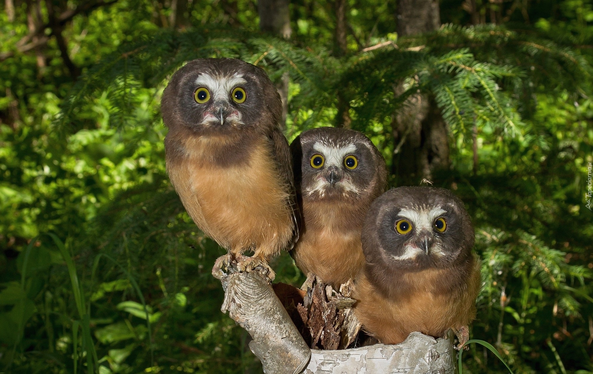 Edytor tapety: Trzy, Sowy, Włochatki, Las