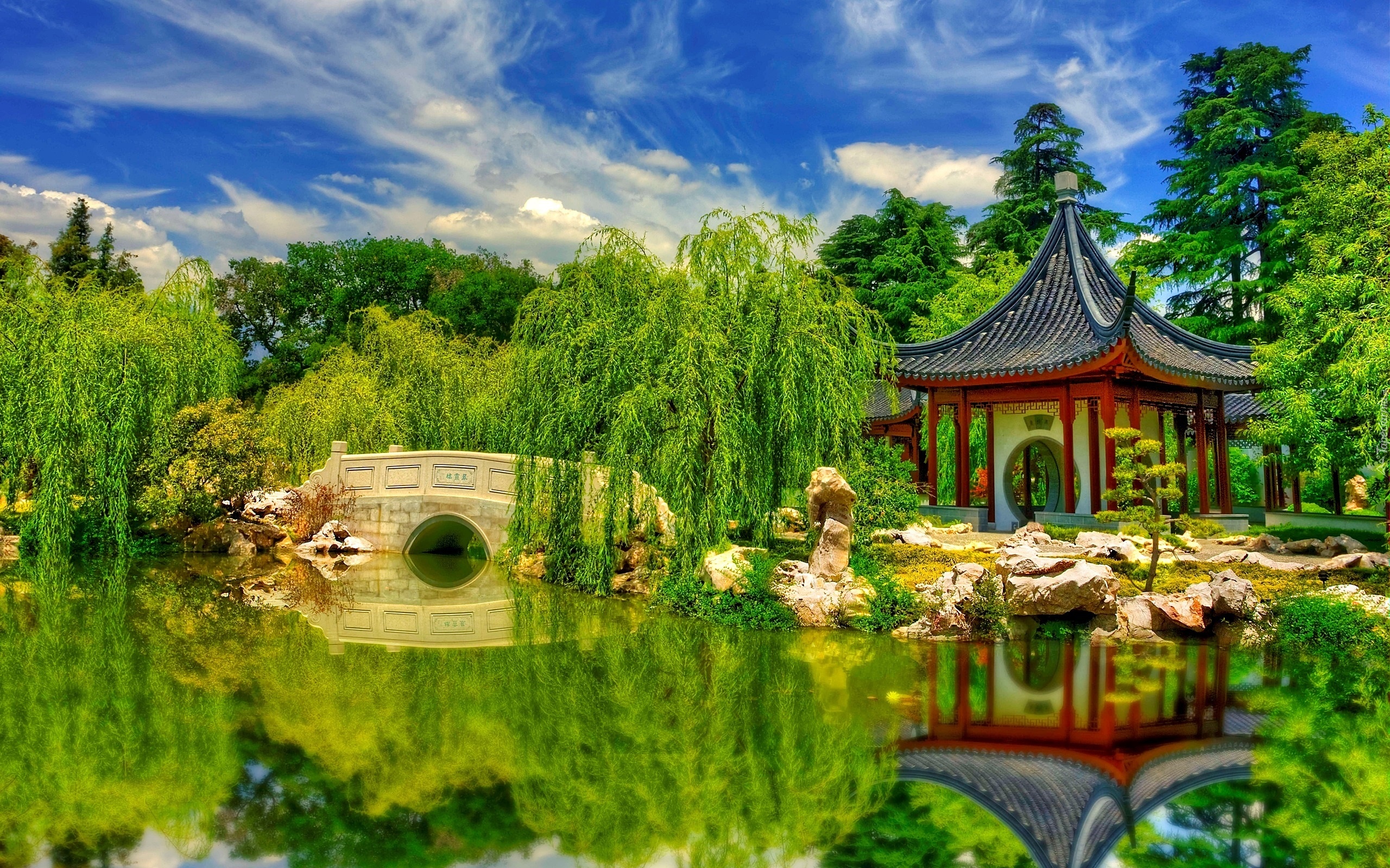 Edytor tapety: Stany Zjednoczone, Stan Kalifornia, Hrabstwo Los Angeles, San Marino, Ogród chiński, Garden of Flowing Fragrance, Altana, Staw, Kamienny mostek, Drzewa, Wierzby płaczące, Kamienie, Odbicie