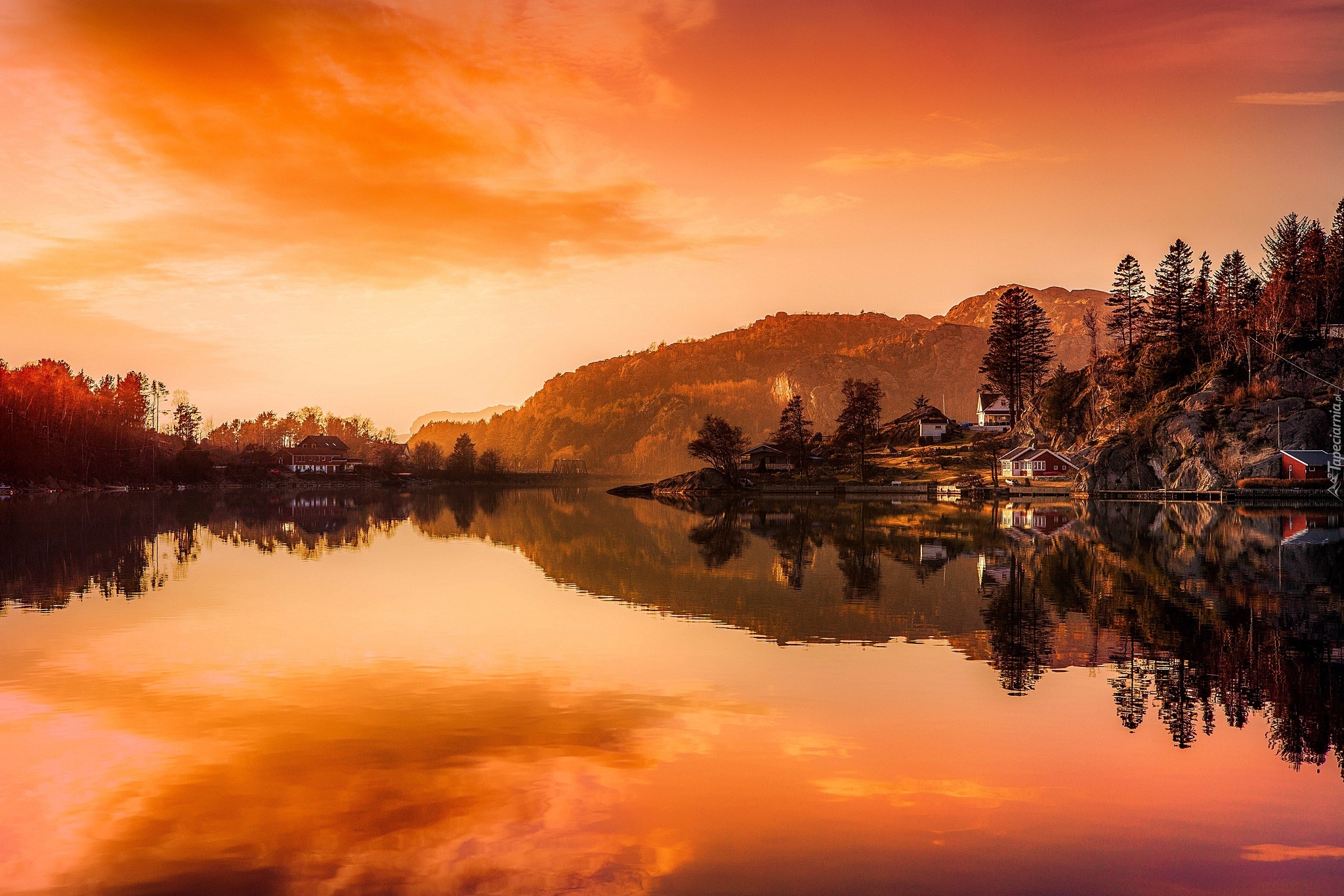 Edytor tapety: Zachód, Słońca, Jezioro, Domy, Odbicie