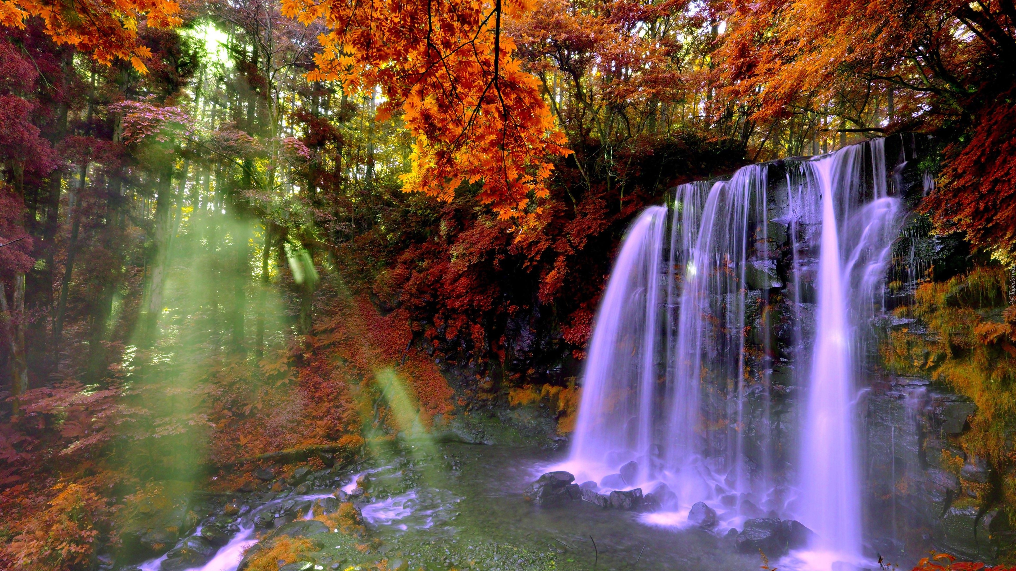 Edytor tapety: Jesień, Las, Wodospad, Promienie, Słońca