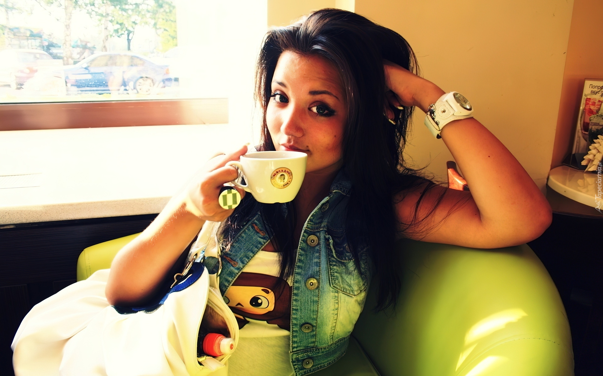 Edytor tapety: Kobieta, Kawa, Filiżanka, Zegarek, Fotel