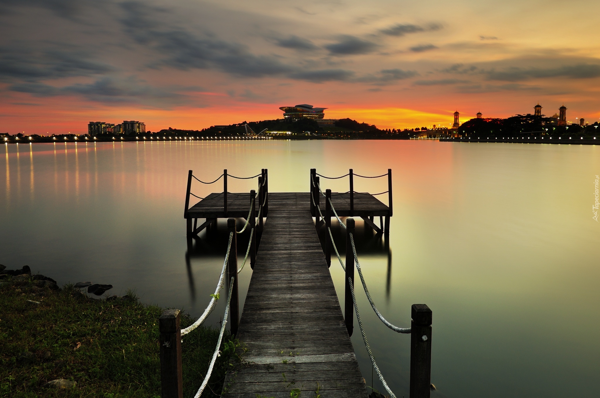 Edytor tapety: Rzeka, Pomost, Zachód, Słońca, Miasto