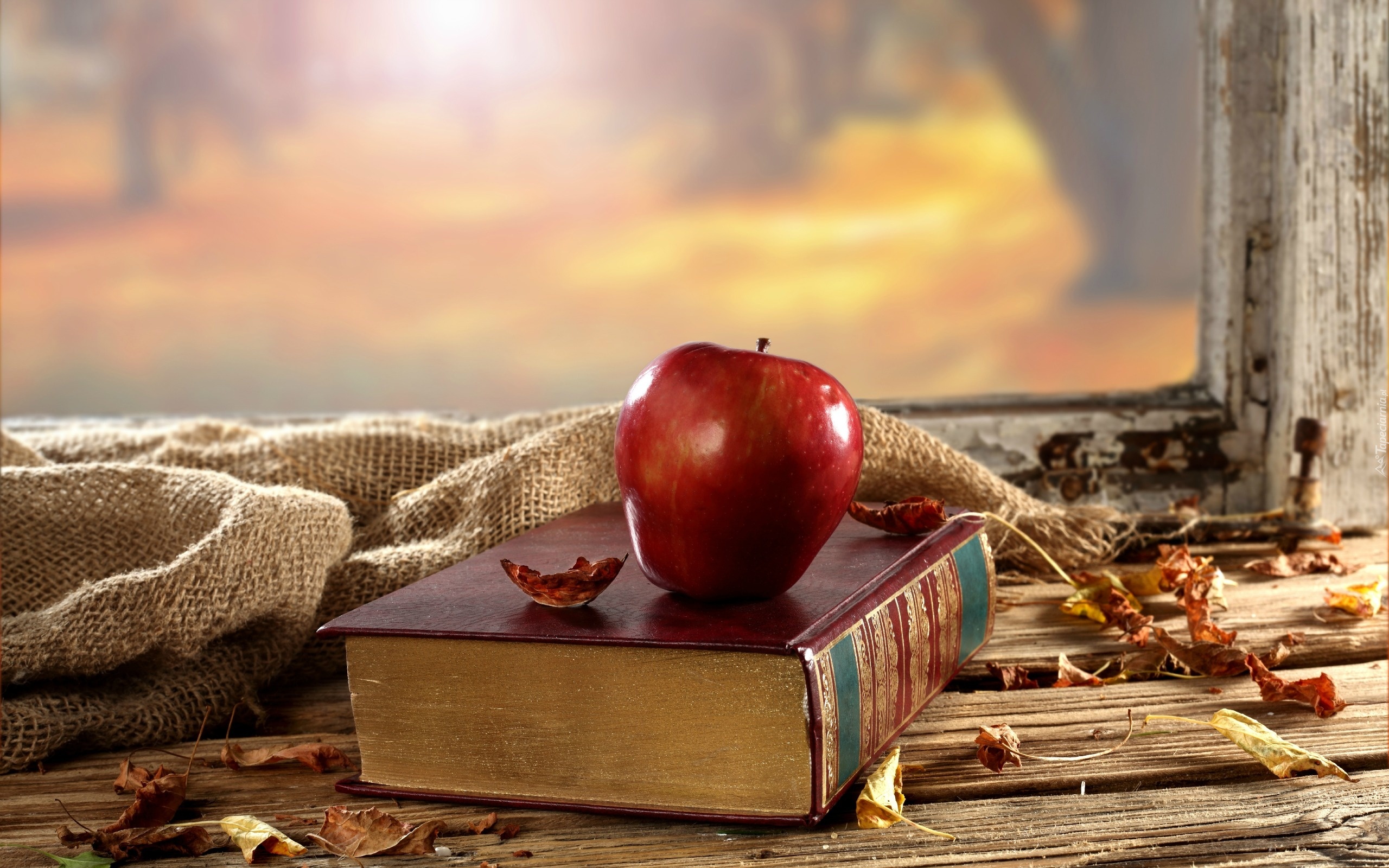 Edytor tapety: Jabłko, Książka, Jesienne, Liście, Okno, Kompozycja