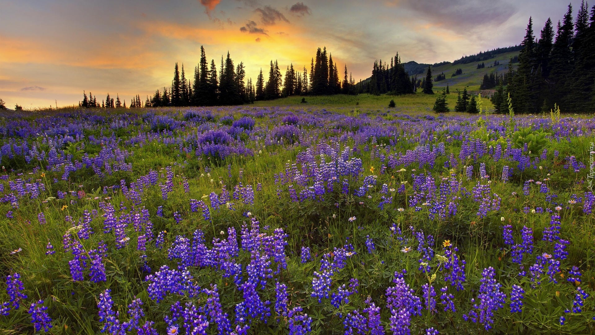 Edytor tapety: Łąka, Promienie, Zachodzącego, Słońca, Drzewa, Łubin