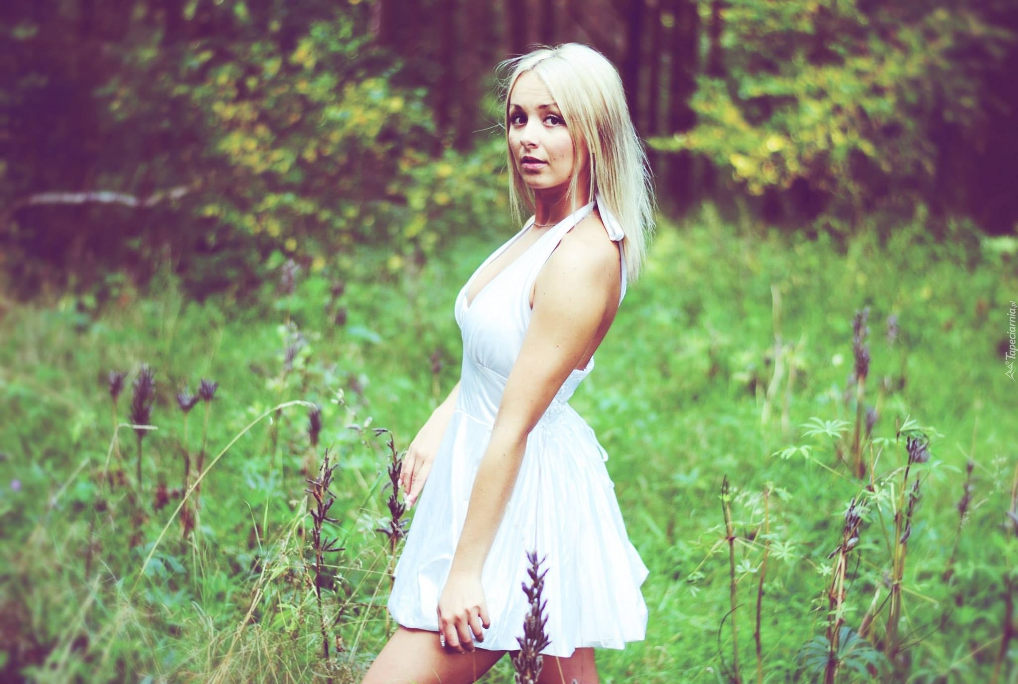 Edytor tapety: Kobieta, Blondynka, Biała, Sukienka