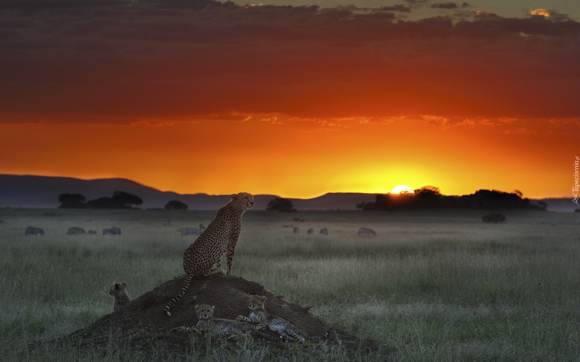 Edytor tapety: Gepardy, Sawanna, Zachód, Słońca