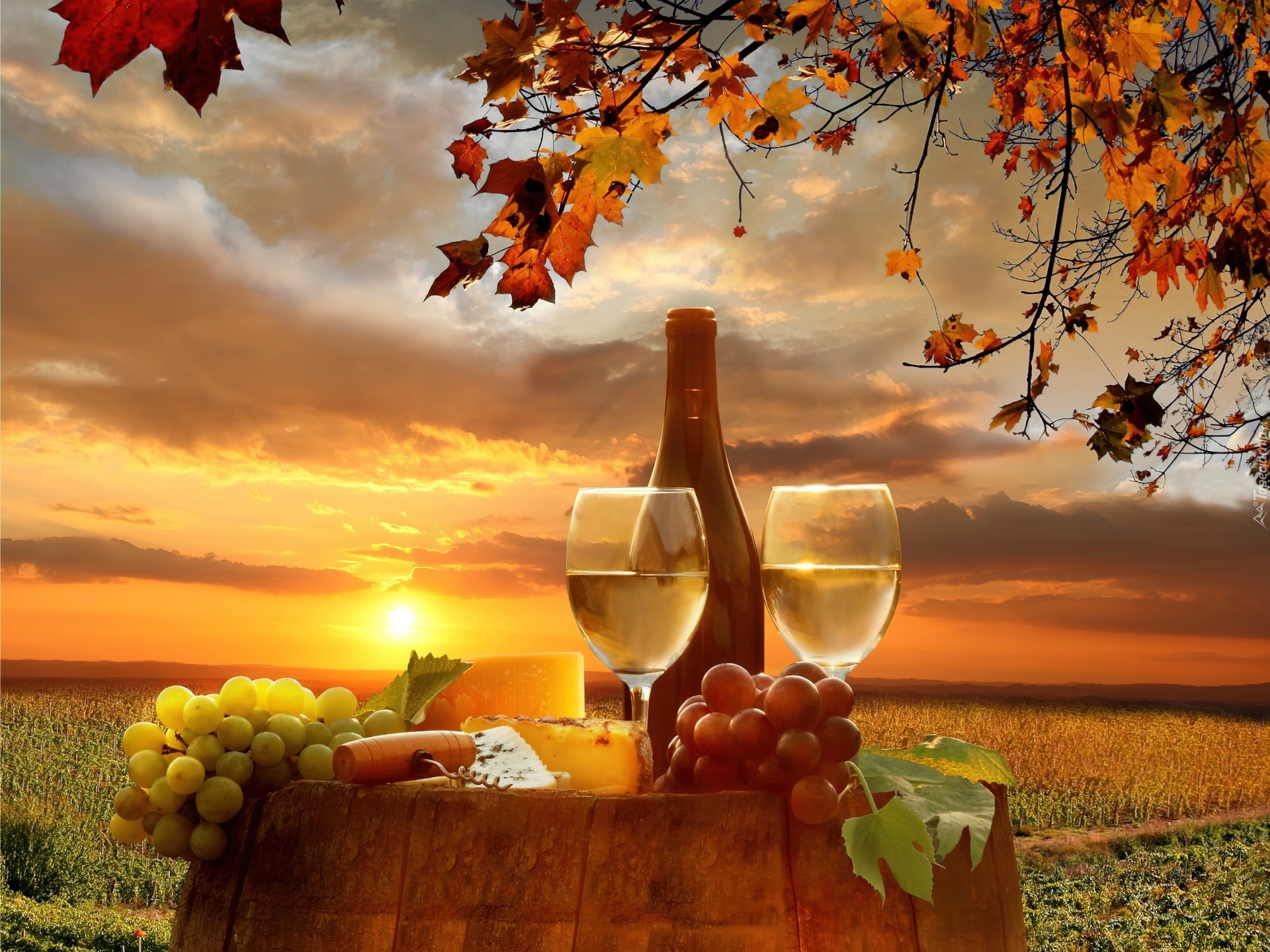 Edytor tapety: Winogronowe, Wino,Beczka, Dębowa, Pola, Zachód, Słońca, Jesień