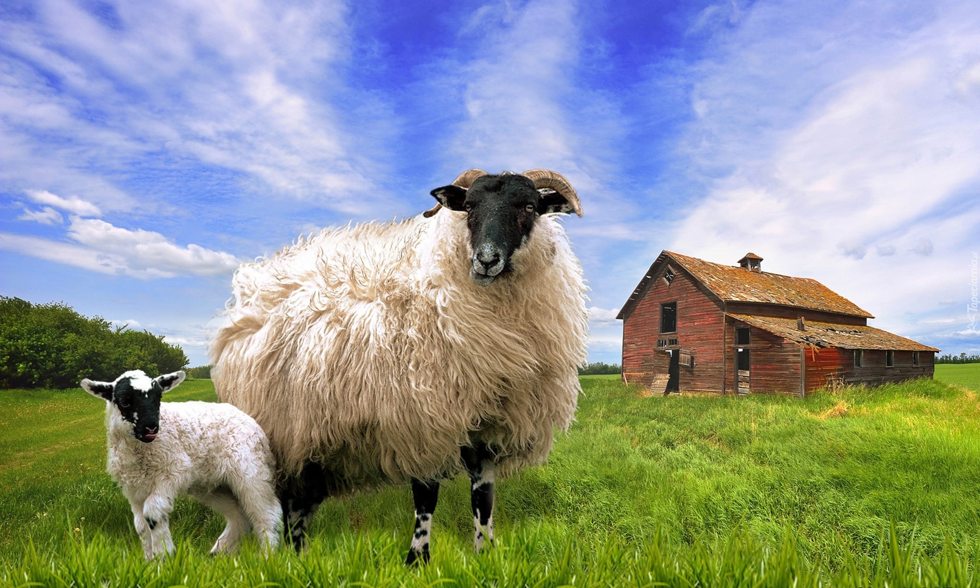 Edytor tapety: Owce, Szopa, Łąka