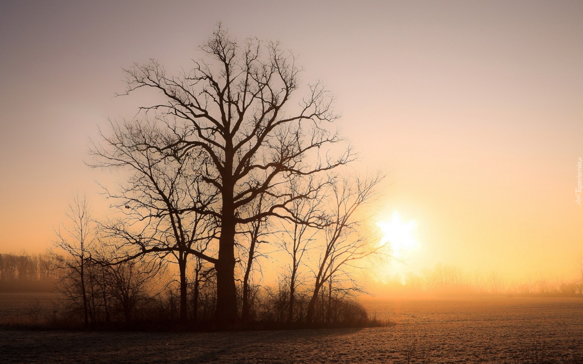 Edytor tapety: Drzewa, Pola, Mgła, Wschód, Słońca, Jesień