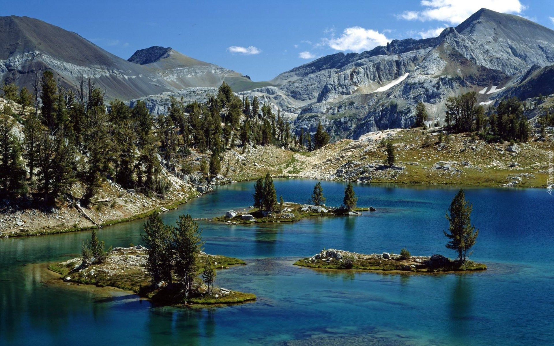 Edytor tapety: Góry, Jezioro, Wysepki, Drzewa