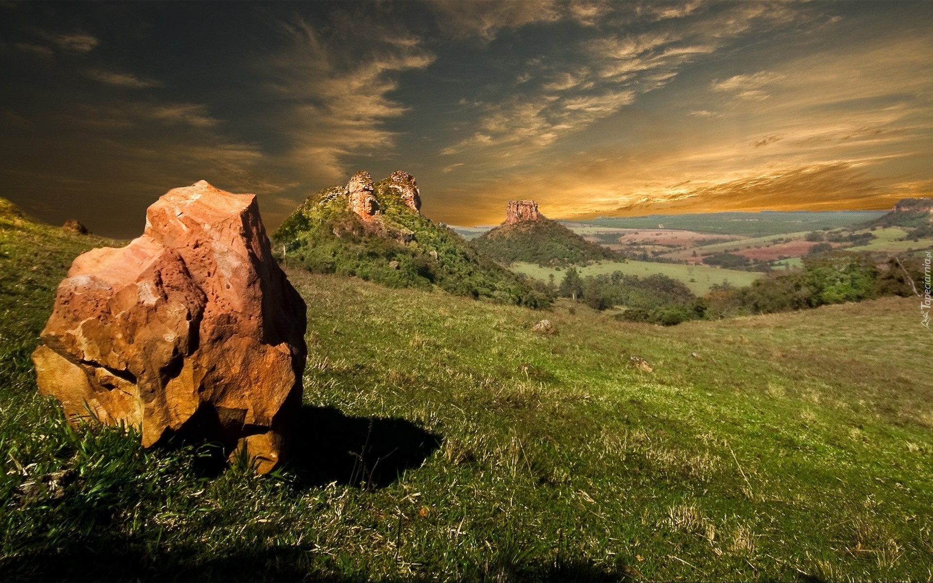 Edytor tapety: Góry, Skały, Lasy, Zachód, Słońca, Panorama