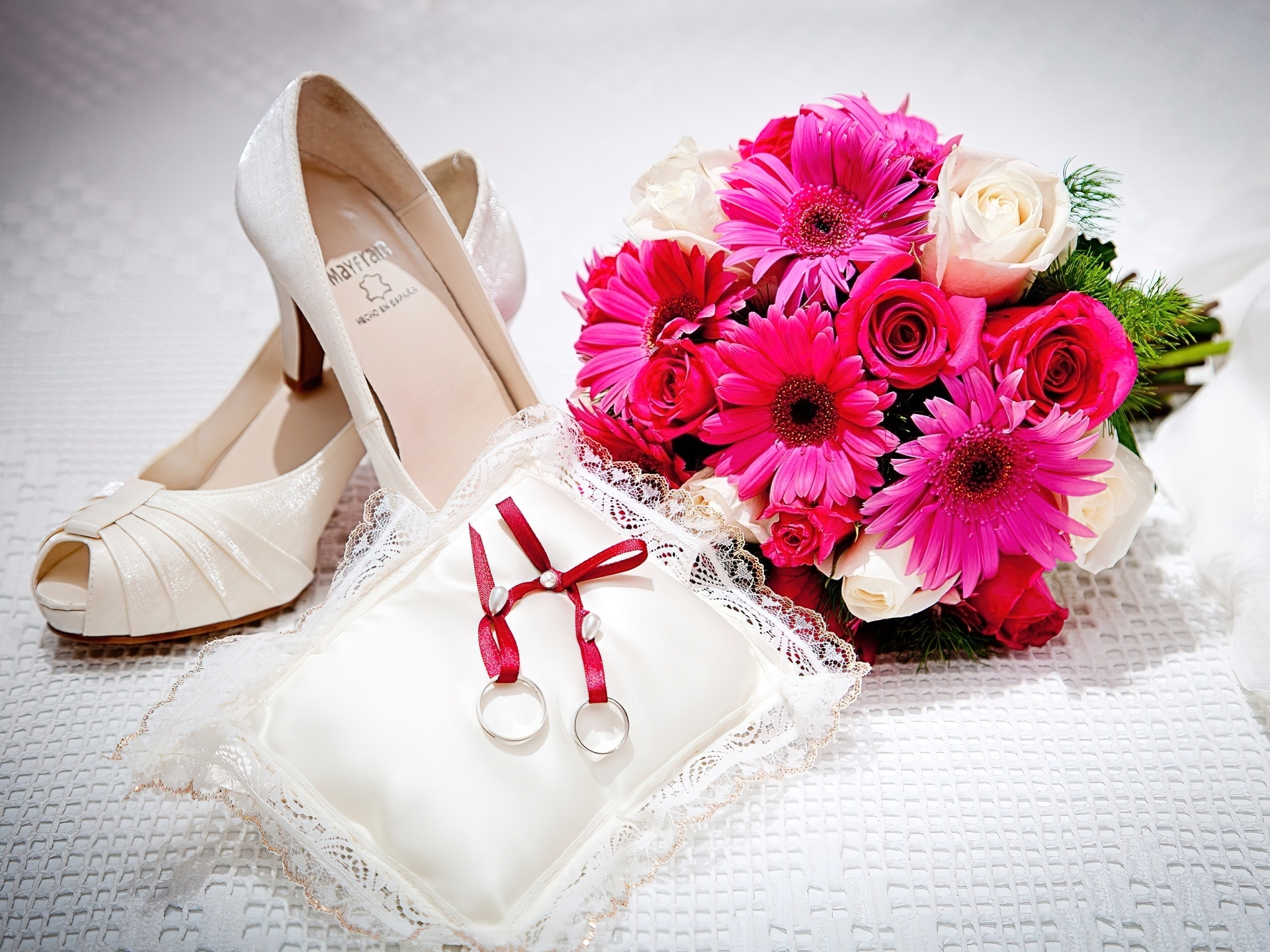Edytor tapety: Ślubny, Bukiet, Buty, Obrączki, Poduszeczka, Kompozycja