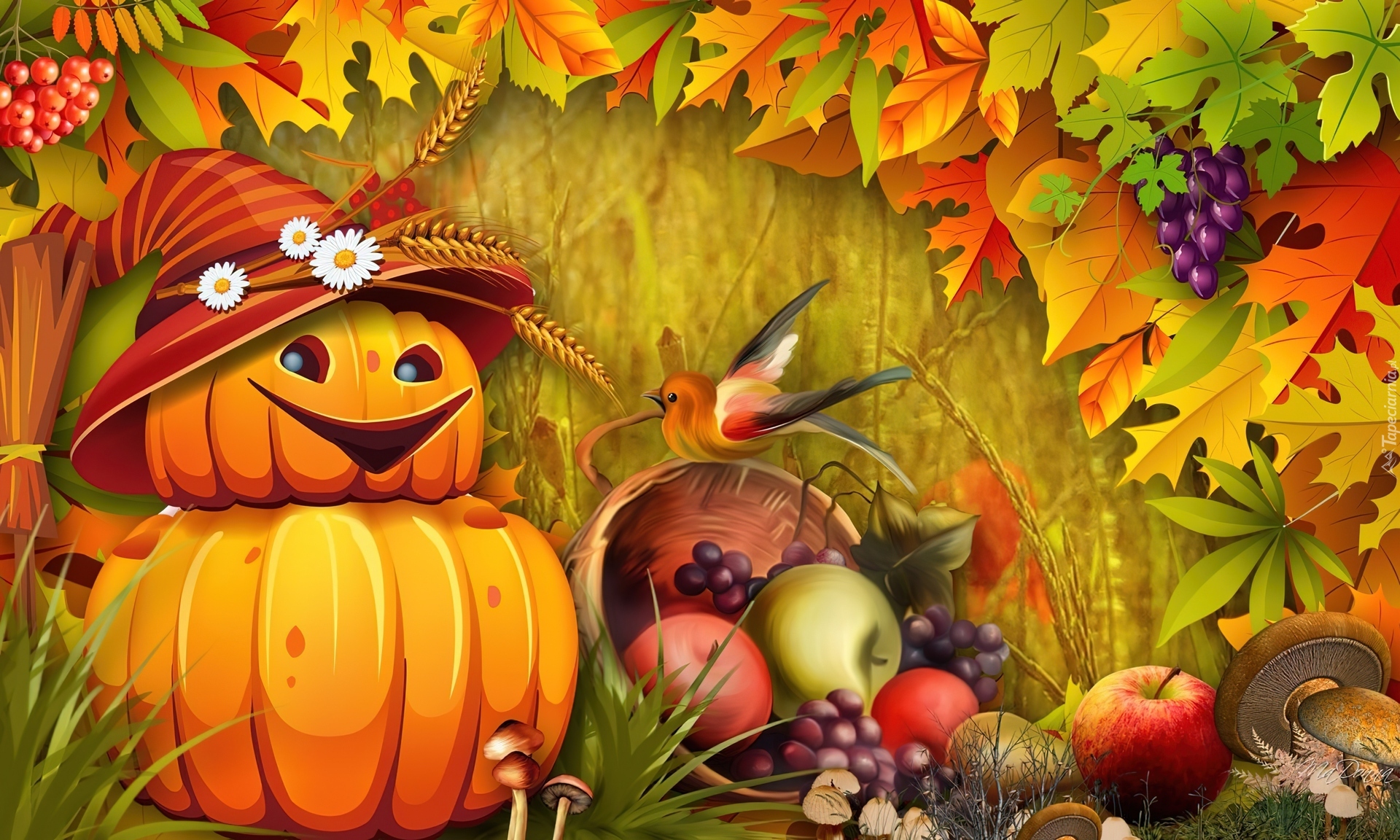Edytor tapety: Jabłka, Winogrono, Liście, Ludek, Kapelusz