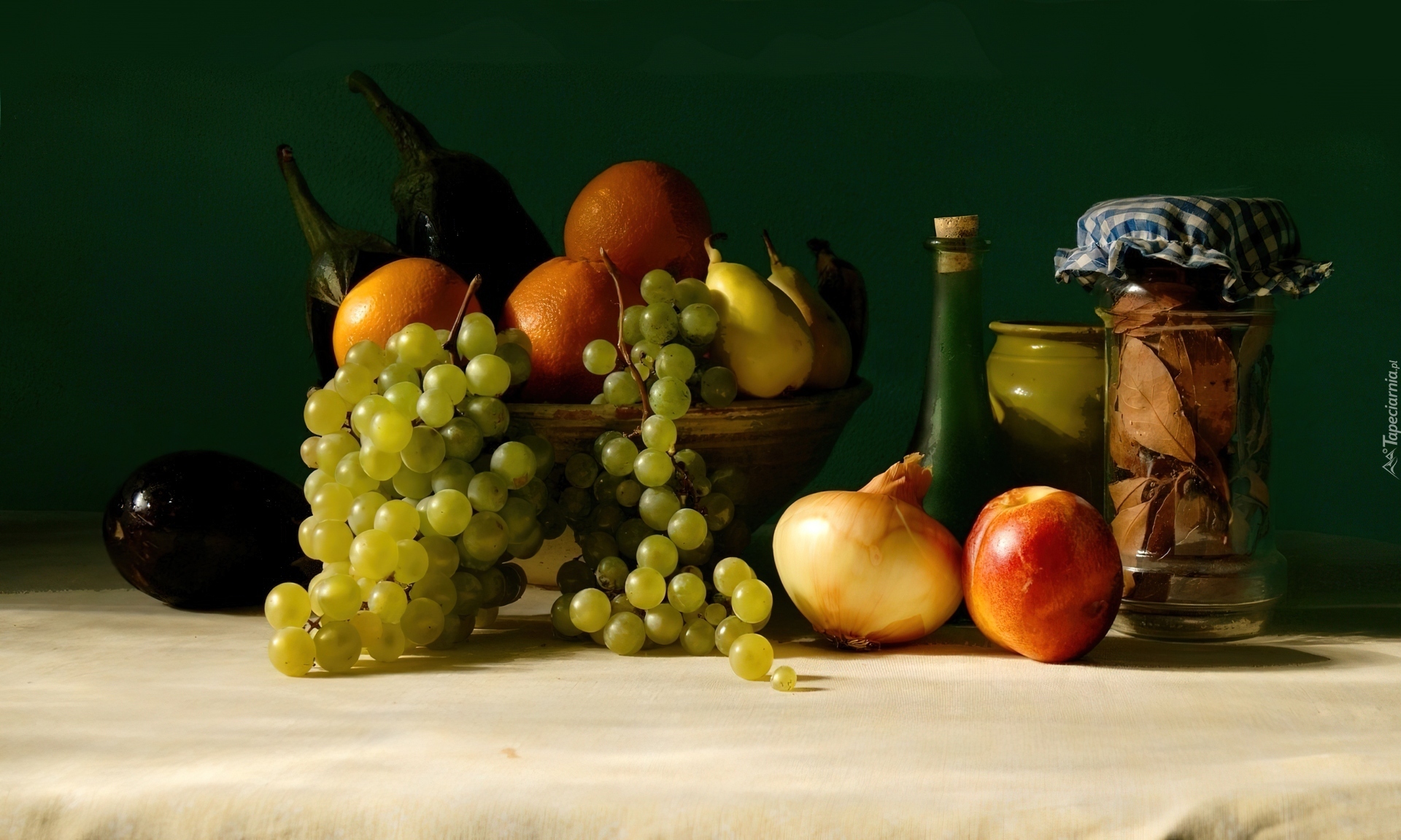 Edytor tapety: Winogron, Cebula, Pomarańcze, Cukinia, Butelka