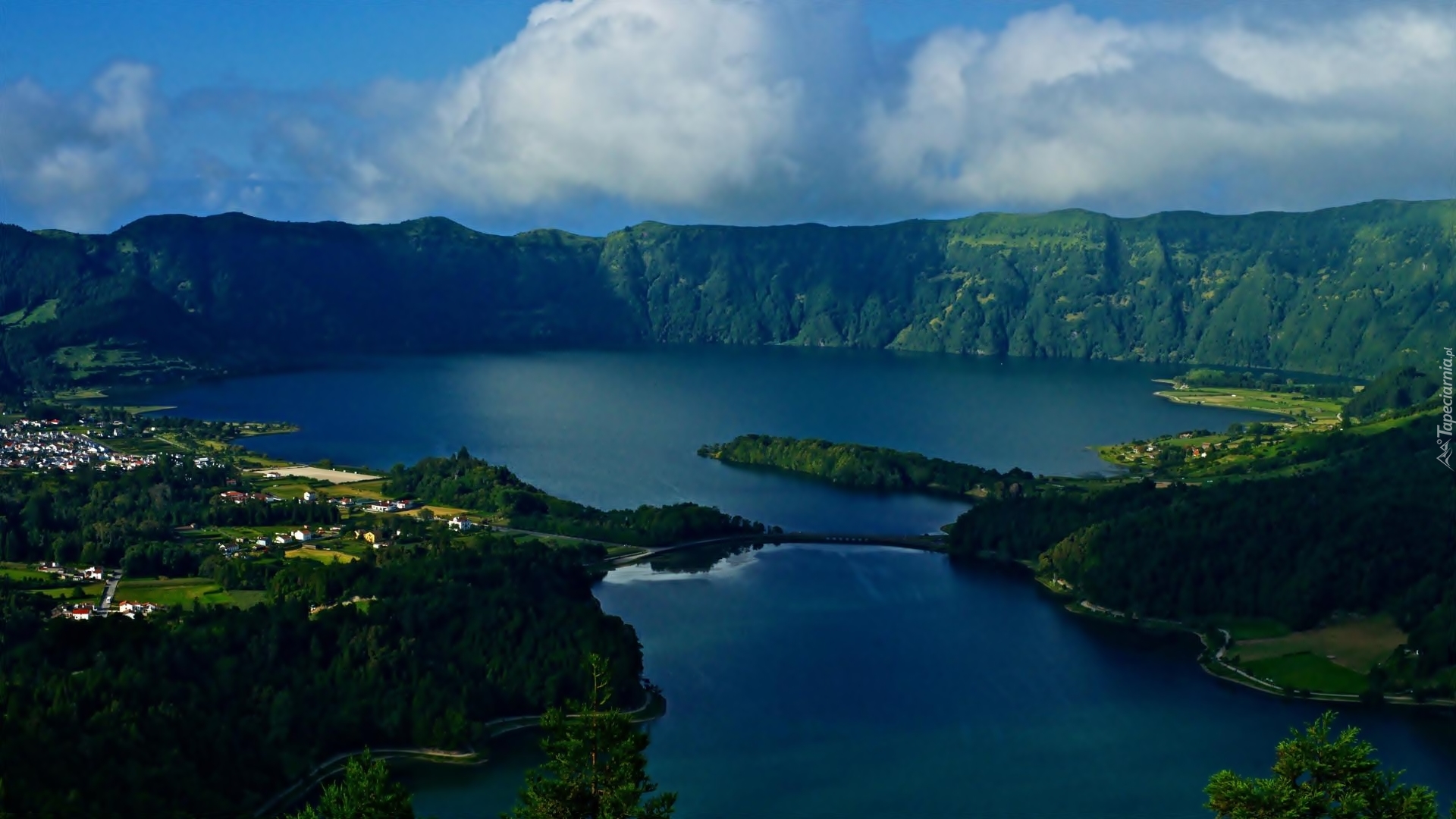 Edytor tapety: Jezioro, Las, Domy