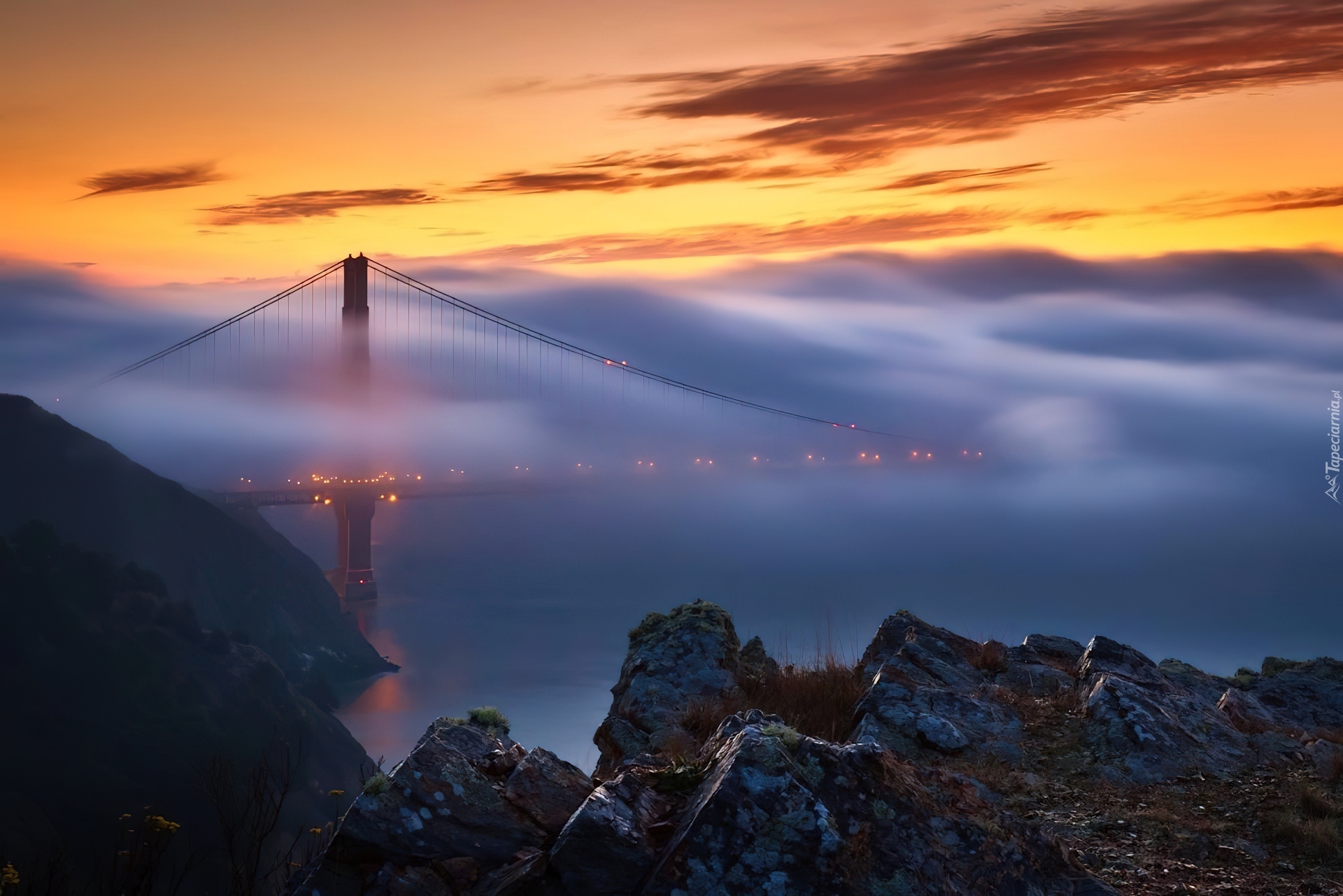 Edytor tapety: Zachód, Słońca, Most, Mgła, Skały