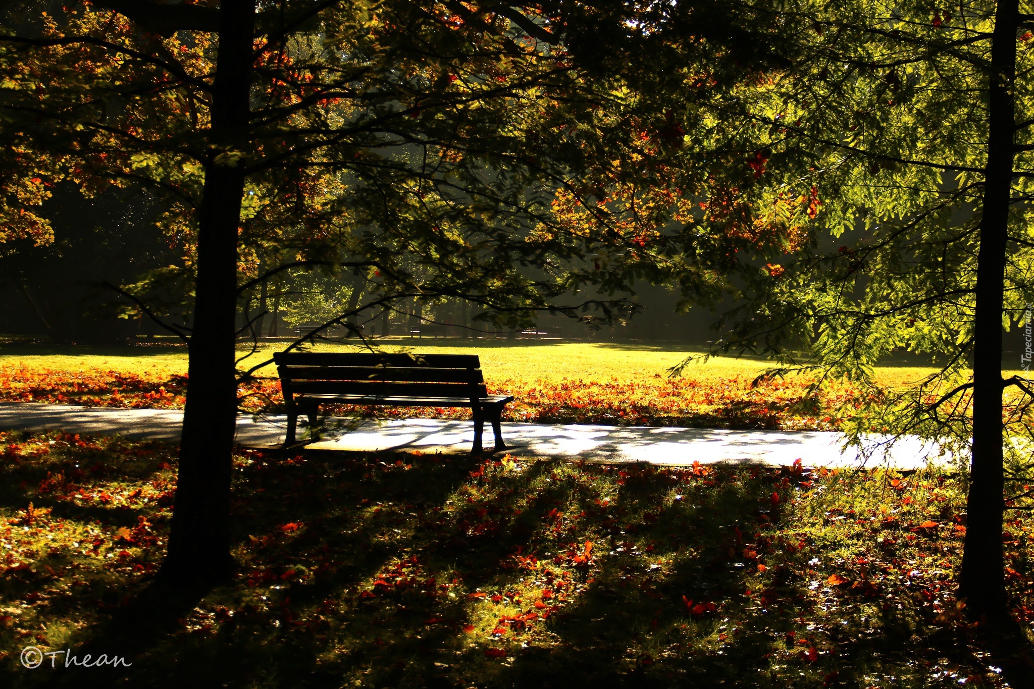 Edytor tapety: Park, Drzewa, Ławka, Poranek, Jesień