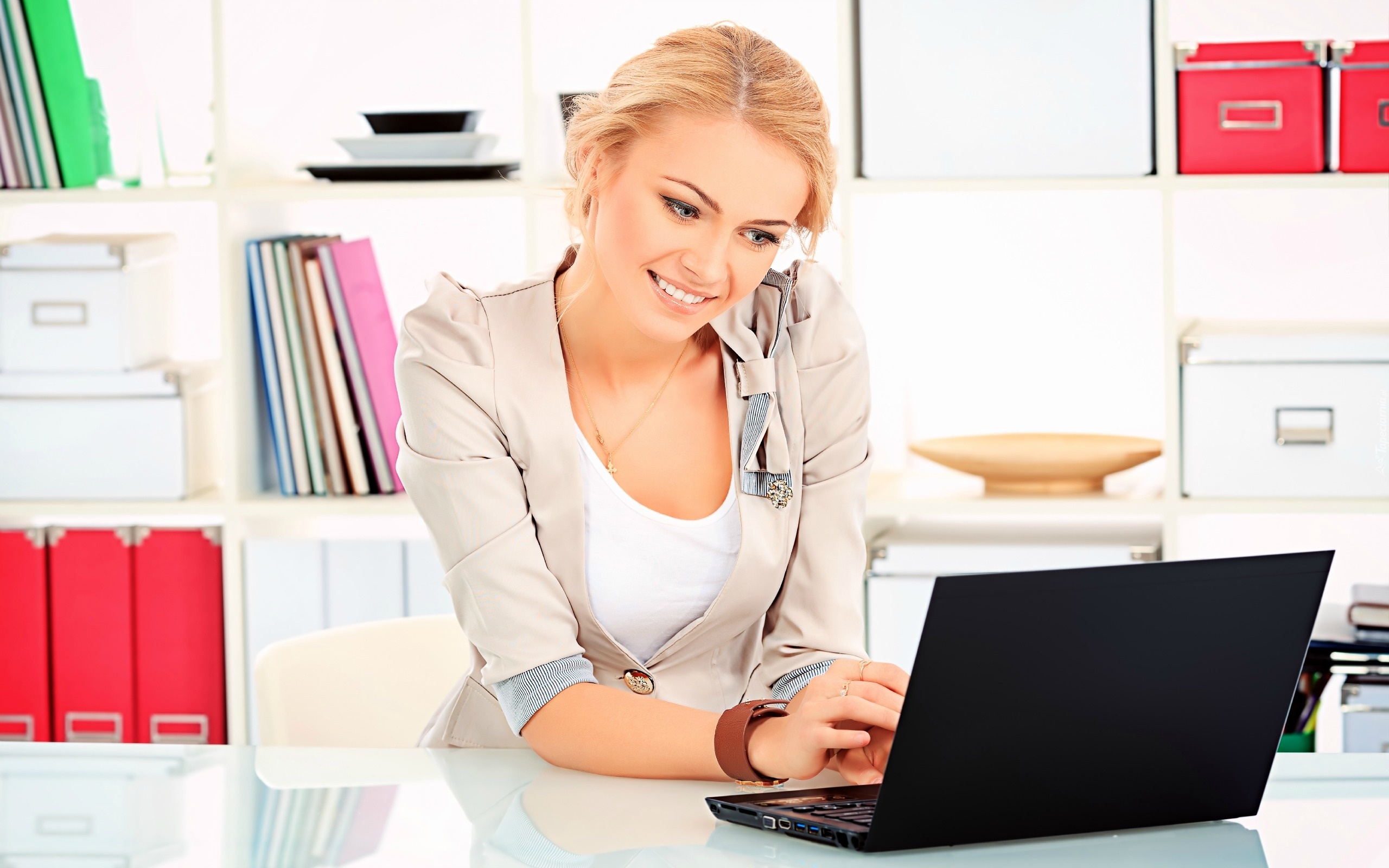 Edytor tapety: Uśmiechnięta, Blondynka, Laptop, Biuro