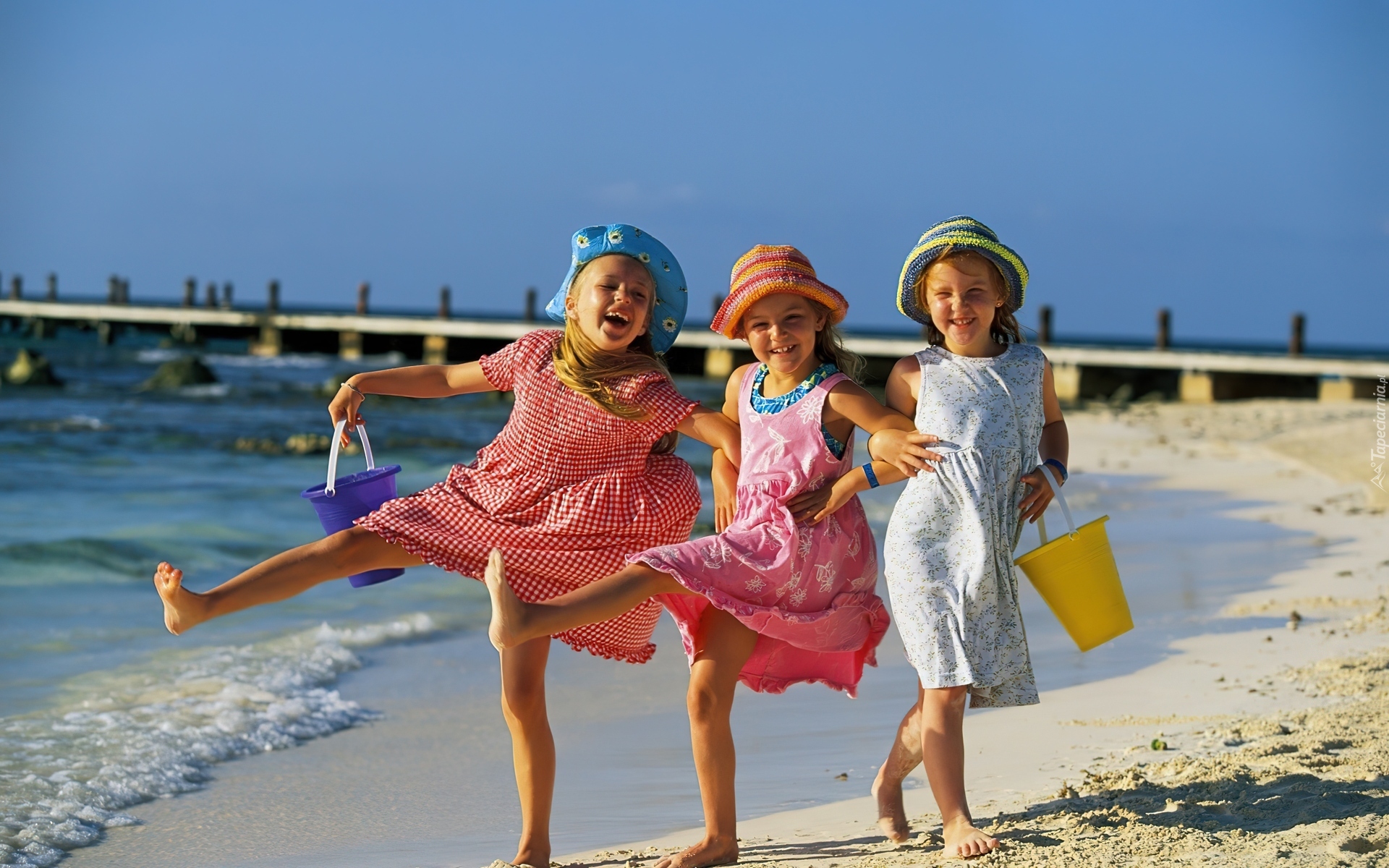 Edytor tapety: Dzieci, Plaża, Woda, Most, Wiaderka, Zabawa