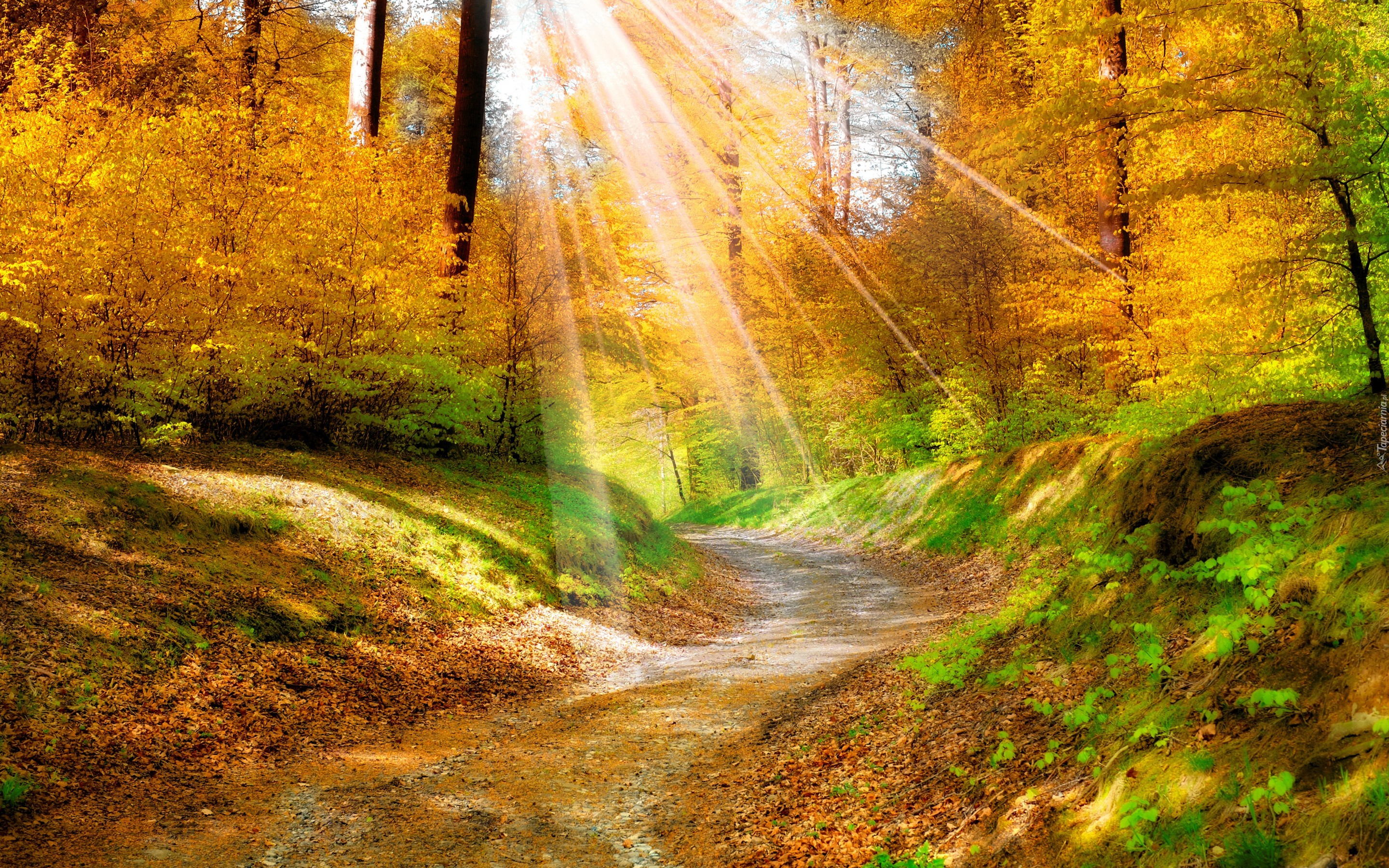 Edytor tapety: Las, Droga, Promienie, Słońca, Jesień