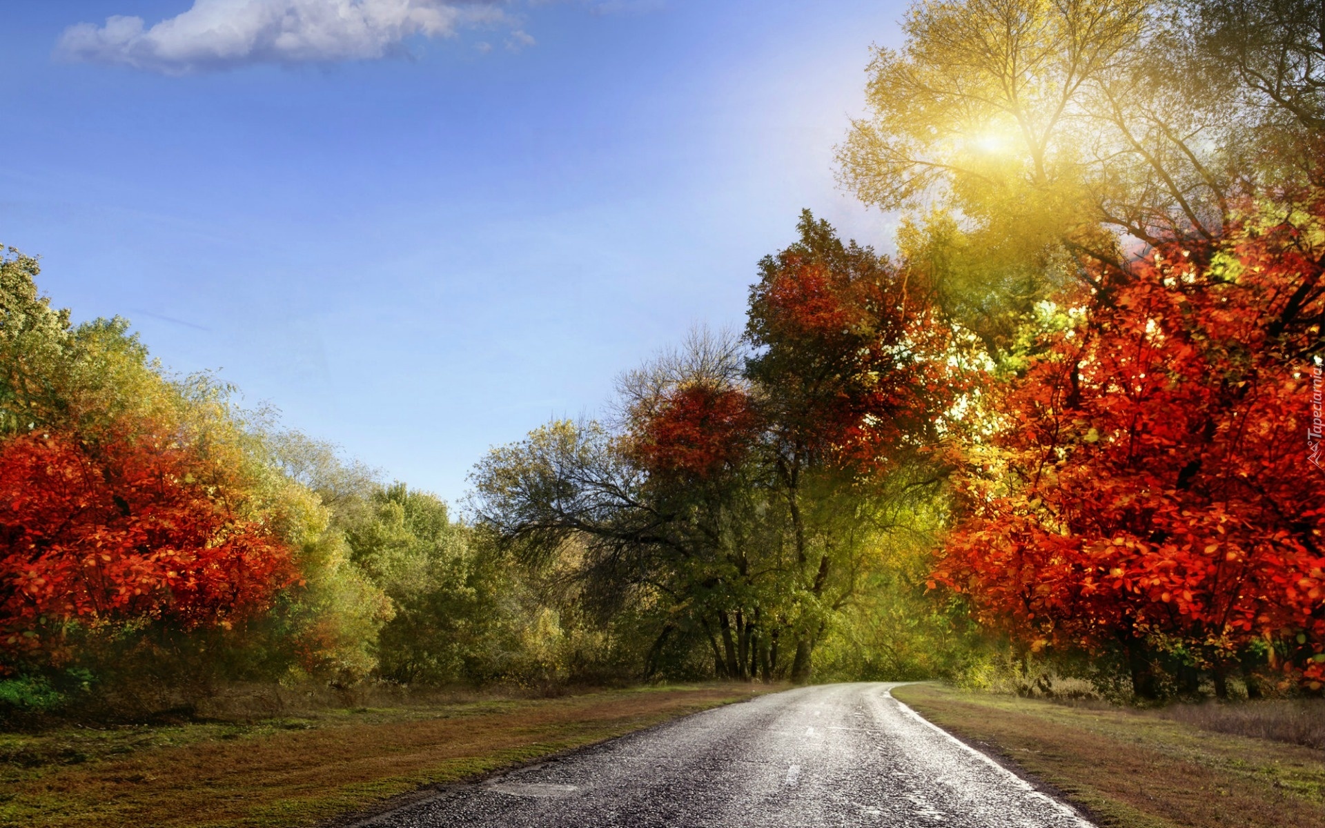 Edytor tapety: Droga, Kolorowe, Drzewa, Promienie, Słońca, Jesień