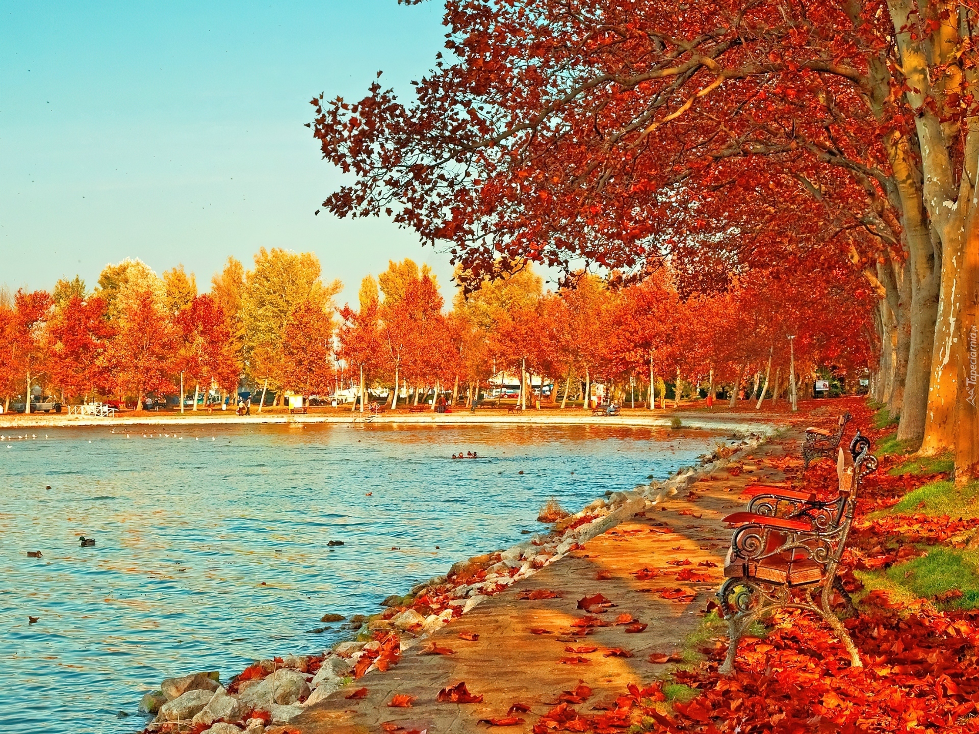 Edytor tapety: Park, Staw, Kaczki, Ławki, Liście, Jesień