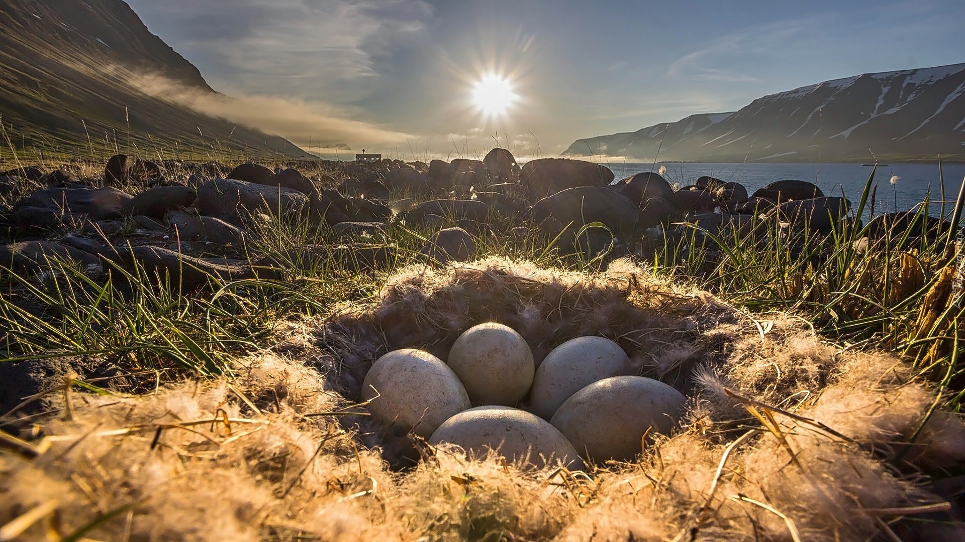 Edytor tapety: Gniazdo, Piórka, Jajka, Góry, Jezioro