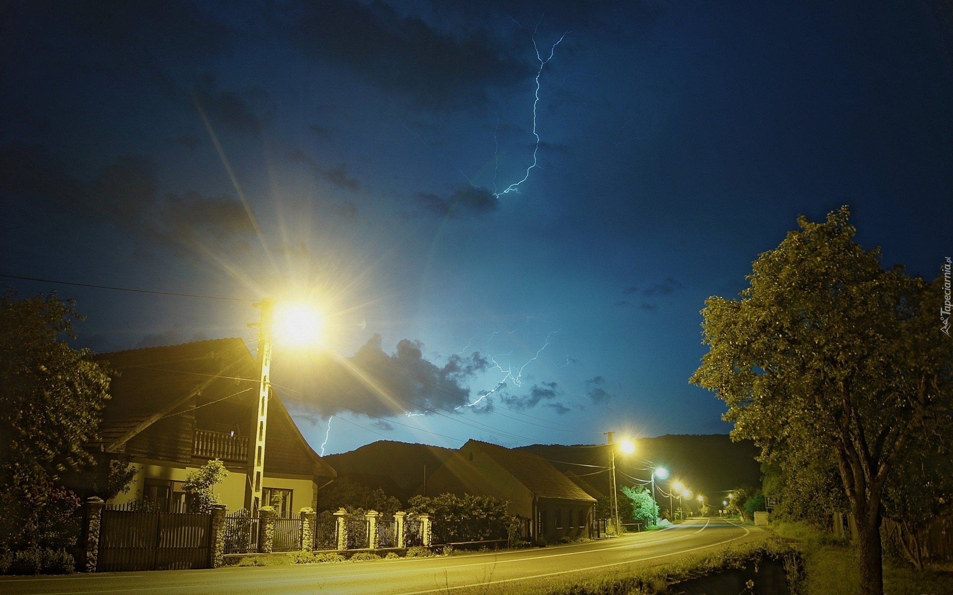 Edytor tapety: Droga, Domy, Noc, Światła, Lamp