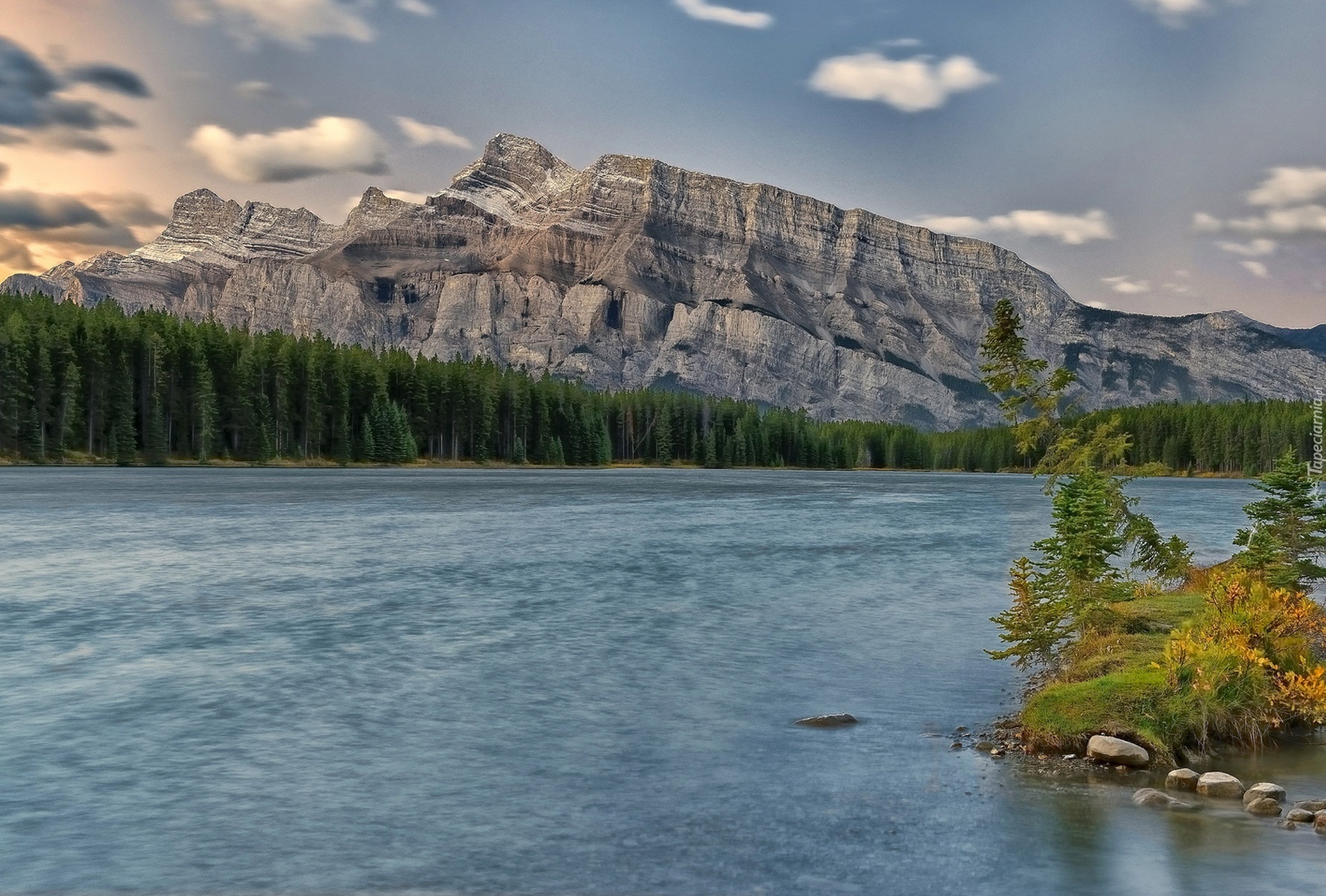 Edytor tapety: Góry, Rzeka, Drzewa, Las, Chmury, Niebo