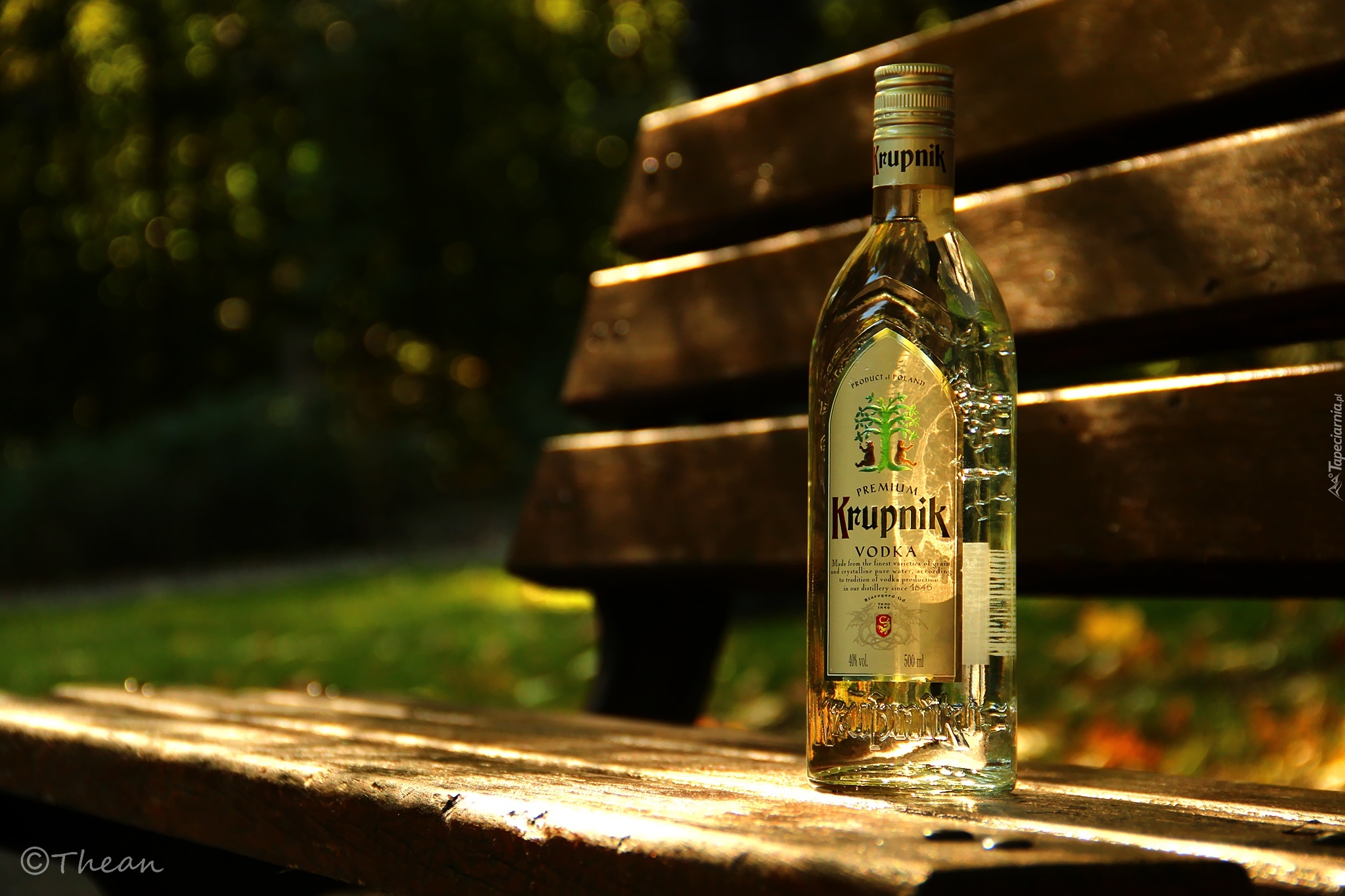 Edytor tapety: Wódka, Polska, Krupnik, Butelka, Ławka