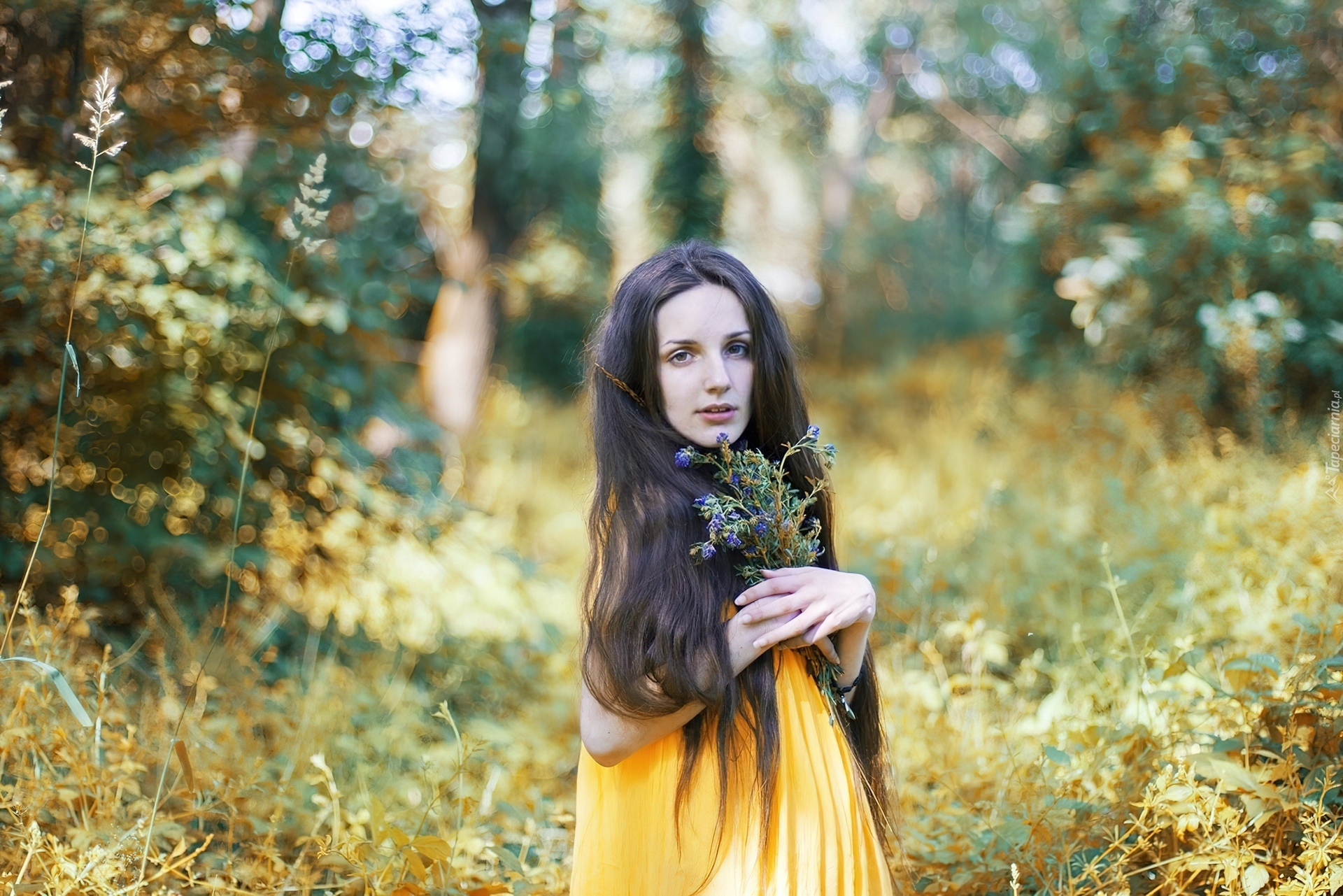 Edytor tapety: Kobieta, Brunetka, Żółta, Sukienka, Bukiet, Kwiatów