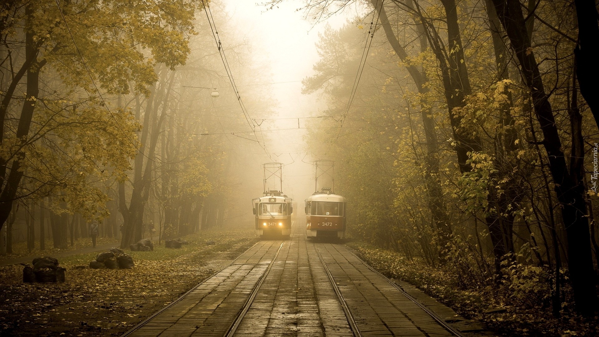 Edytor tapety: Tramwaje, Szyny, Drzewa, Mgła