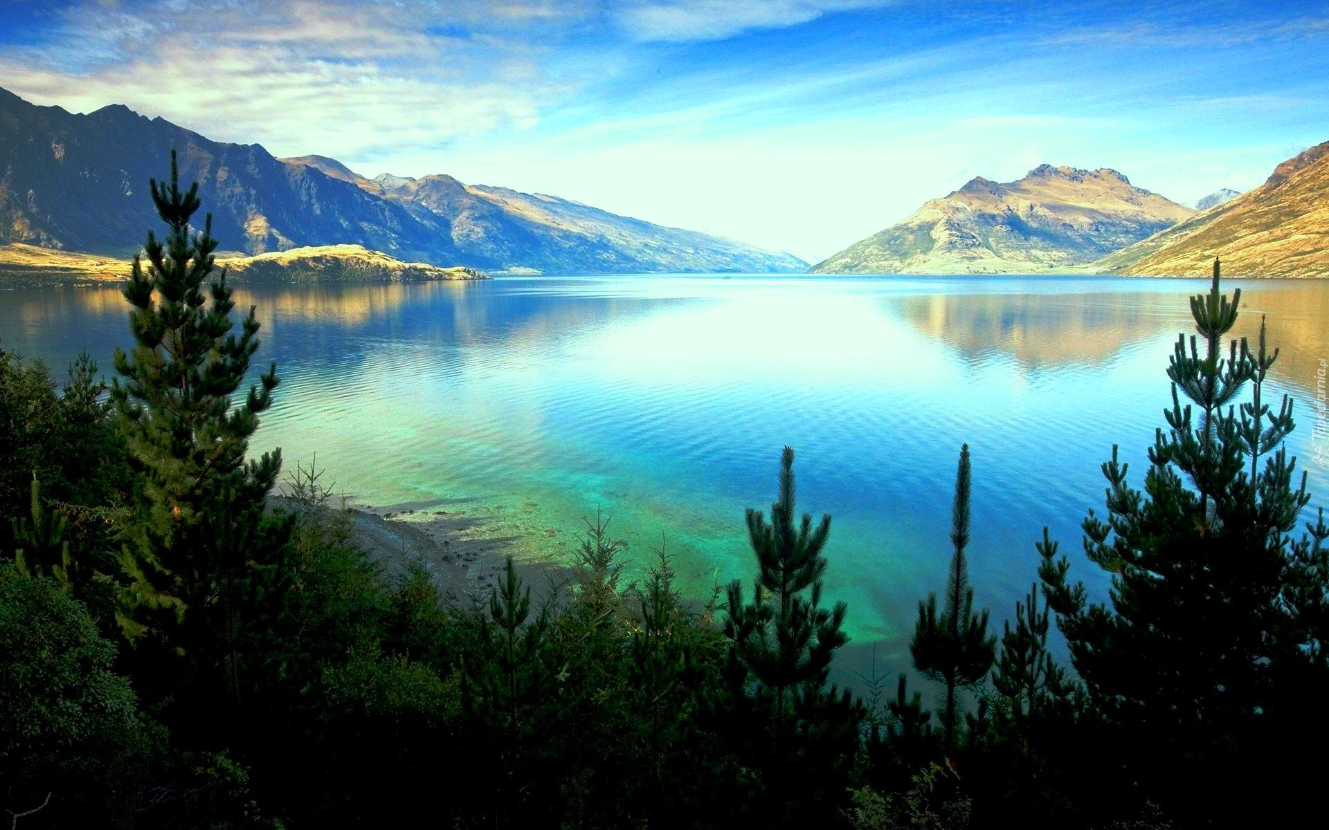 Edytor tapety: Jezioro, Góry, Drzewa, Nowa Zelandia