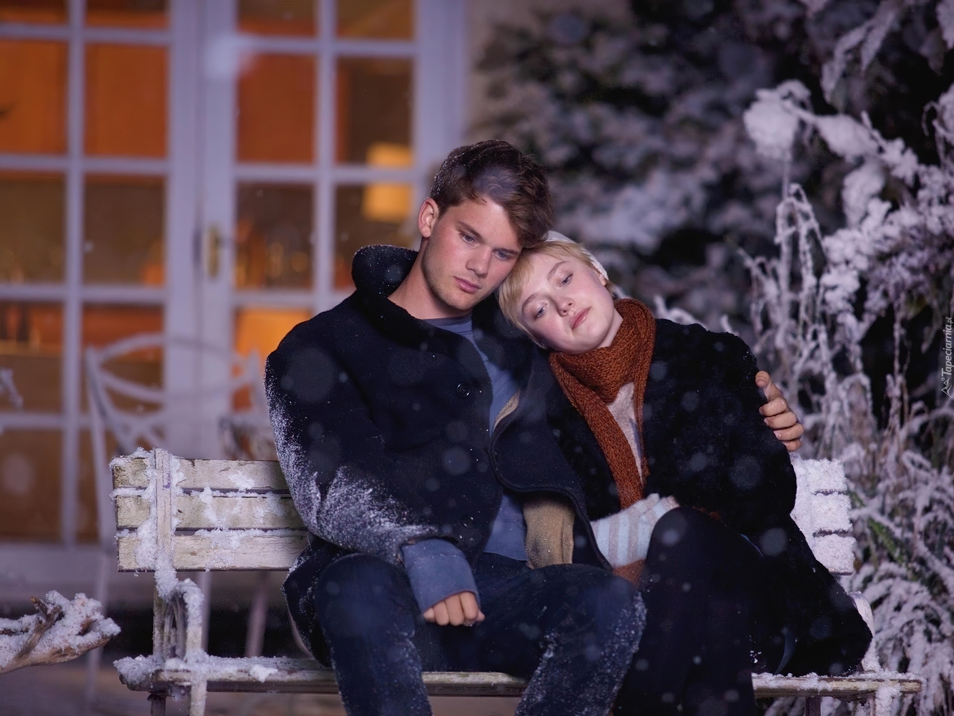 Edytor tapety: Film, Dakota Fanning, Aktor, Jeremy Irvine, Ławka, Śnieg