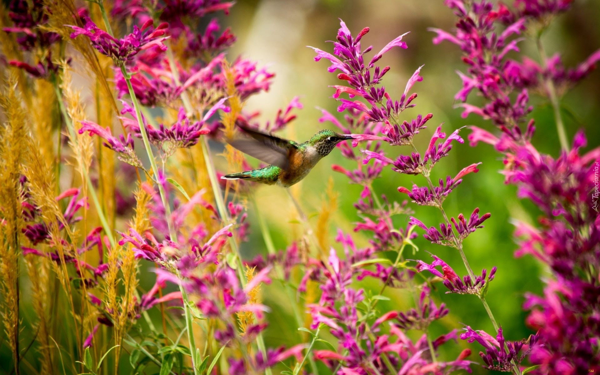 Edytor tapety: Koliber, Różowe, Kwiaty